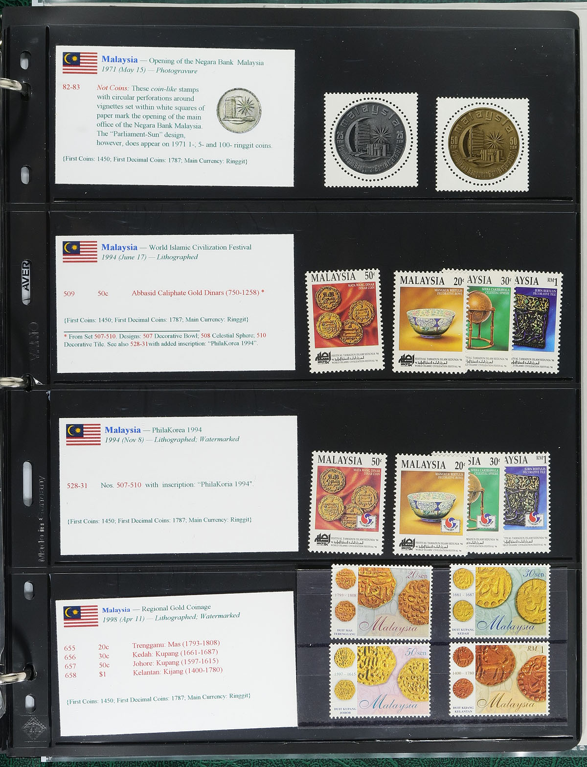 "Coins on Stamps" PART G. Lovely comprehensive topical collection containing countries ranging from K (Kazakhstan) to M (Mali), containing a few hundred items with representation from 18 issuing countries or states. The collection contains mint or used singles, sets, souvenir sheets, first day covers, sheetlets and more, along with well researched text detailing the relationship between philately and numismatics, with each philatelic item well identified by Scott number along with additional printing information. A spot check indicated items cataloguing $10 to $20 and up, with the owner's older Scott catalogue value for the binder totaling US$581.00. An exhibit worthy collection, and very fine. Estimate =