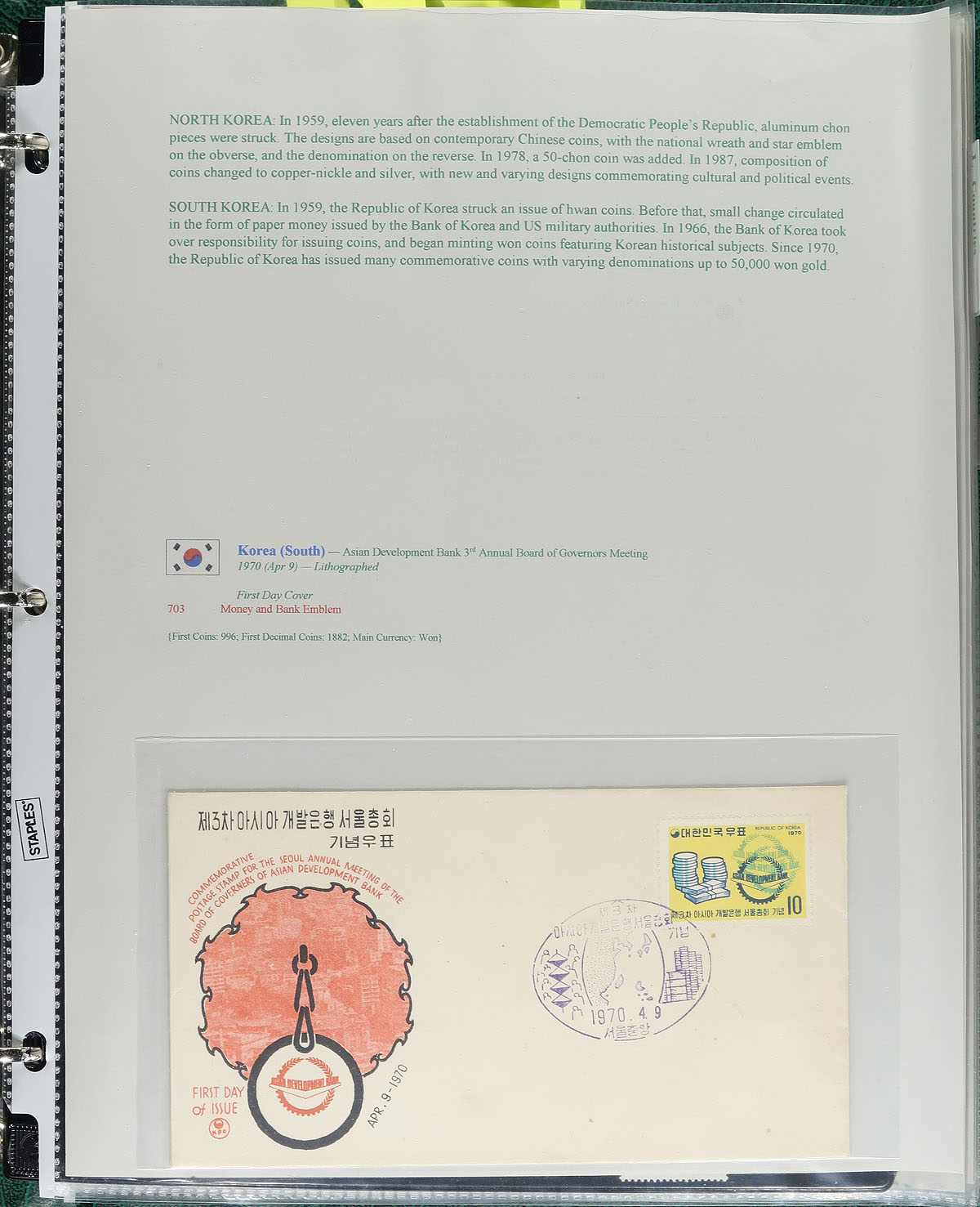 "Coins on Stamps" PART G. Lovely comprehensive topical collection containing countries ranging from K (Kazakhstan) to M (Mali), containing a few hundred items with representation from 18 issuing countries or states. The collection contains mint or used singles, sets, souvenir sheets, first day covers, sheetlets and more, along with well researched text detailing the relationship between philately and numismatics, with each philatelic item well identified by Scott number along with additional printing information. A spot check indicated items cataloguing $10 to $20 and up, with the owner's older Scott catalogue value for the binder totaling US$581.00. An exhibit worthy collection, and very fine. Estimate =