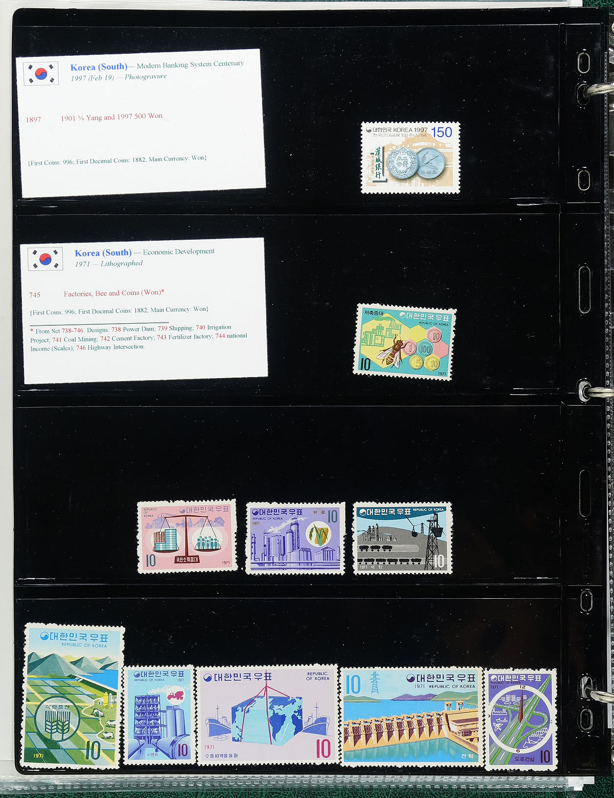 "Coins on Stamps" PART G. Lovely comprehensive topical collection containing countries ranging from K (Kazakhstan) to M (Mali), containing a few hundred items with representation from 18 issuing countries or states. The collection contains mint or used singles, sets, souvenir sheets, first day covers, sheetlets and more, along with well researched text detailing the relationship between philately and numismatics, with each philatelic item well identified by Scott number along with additional printing information. A spot check indicated items cataloguing $10 to $20 and up, with the owner's older Scott catalogue value for the binder totaling US$581.00. An exhibit worthy collection, and very fine. Estimate =