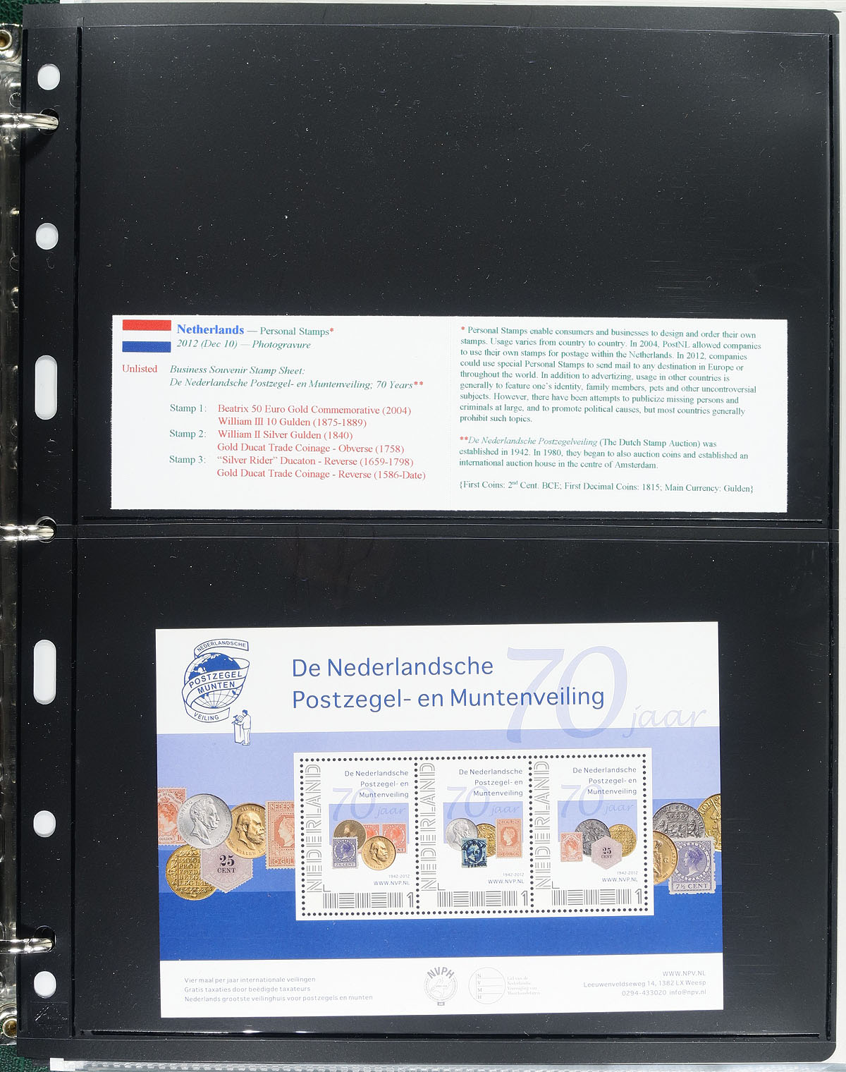 "Coins on Stamps" PART I. Lovely comprehensive topical collection containing countries ranging from N (Nepal) to P (Panama), containing a few hundred items with representation from 16 issuing countries or states. The collection contains mint or used singles, sets, souvenir sheets, first day covers, sheetlets and more, along with well researched text detailing the relationship between philately and numismatics, with each philatelic item well identified by Scott number along with additional printing information. A spot check indicated items cataloguing $10 to $20 and up, with the owner's older Scott catalogue value for the binder totals US$588.00. An exhibit worthy collection, and very fine. Estimate =
