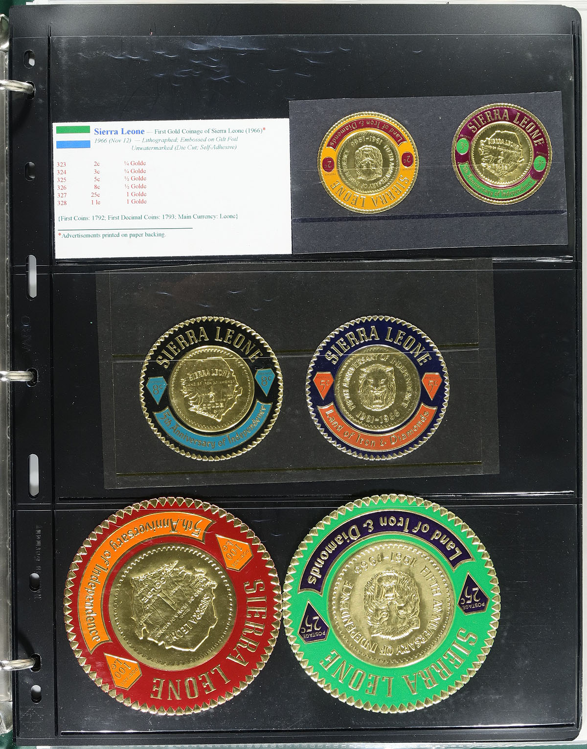 "Coins on Stamps" PART K. Lovely comprehensive topical collection containing countries from S (St. Helena) to S (South Sandwich Islands), containing a few hundred items with representation from 17 issuing countries or states. The collection contains mint or used singles, sets, souvenir sheets, first day covers, sheetlets and more, along with well researched text detailing the relationship between philately and numismatics, with each philatelic item well identified by Scott number along with additional printing information. A spot check indicated items cataloguing $10 to $20 and up, with the owner's older Scott catalogue value for the binder totals US$643.00. An exhibit worthy collection and very fine. Estimate =
