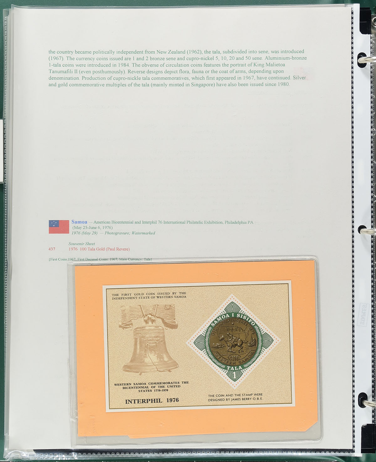 "Coins on Stamps" PART K. Lovely comprehensive topical collection containing countries from S (St. Helena) to S (South Sandwich Islands), containing a few hundred items with representation from 17 issuing countries or states. The collection contains mint or used singles, sets, souvenir sheets, first day covers, sheetlets and more, along with well researched text detailing the relationship between philately and numismatics, with each philatelic item well identified by Scott number along with additional printing information. A spot check indicated items cataloguing $10 to $20 and up, with the owner's older Scott catalogue value for the binder totals US$643.00. An exhibit worthy collection and very fine. Estimate =
