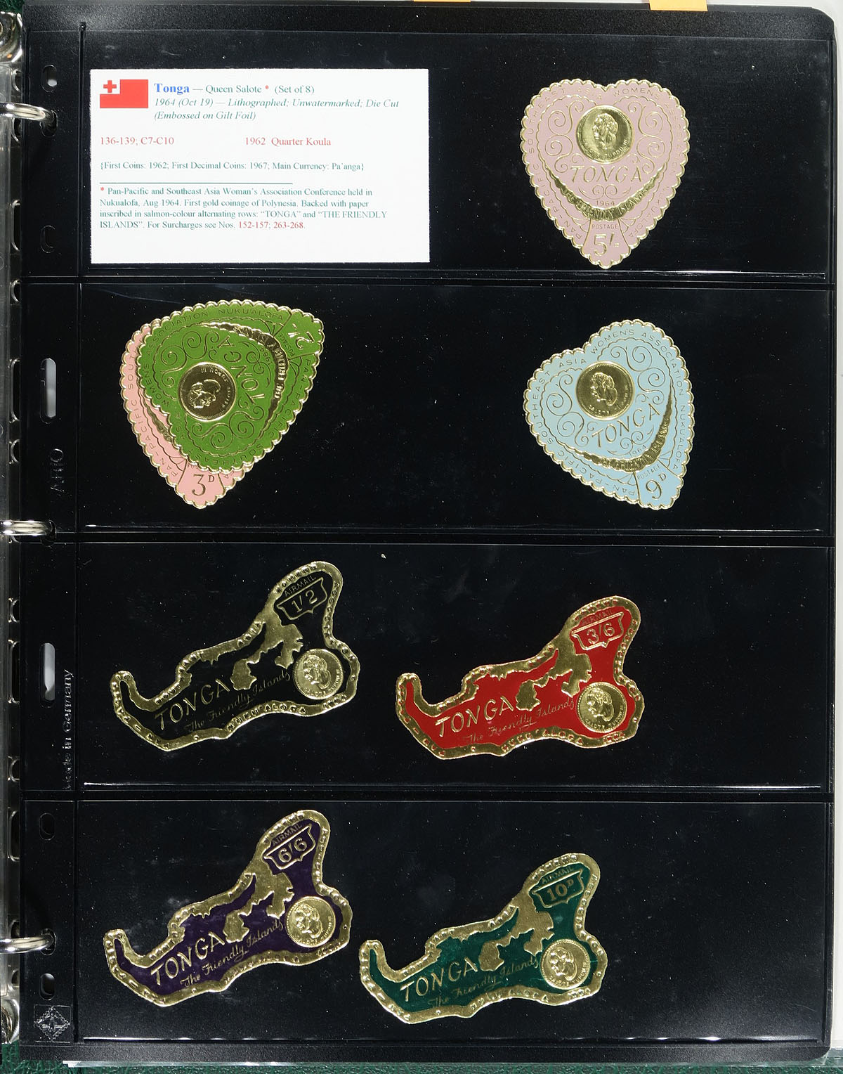 "Coins on Stamps" PART L. Lovely comprehensive topical collection containing countries from S (Spain) to T (Tonga), containing a few hundred items with representation from 8 issuing countries or states. The collection contains mint or used singles, sets, souvenir sheets, first day covers, sheetlets and more, along with well researched text detailing the relationship between philately and numismatics, with each philatelic item well identified by Scott number along with additional printing information. A spot check indicated items cataloguing $10 to $20 and up (much strength in Tonga sets), with the owner's older Scott catalogue value for the binder totals US$1,102.00. An exhibit worthy collection and very fine. Estimate =