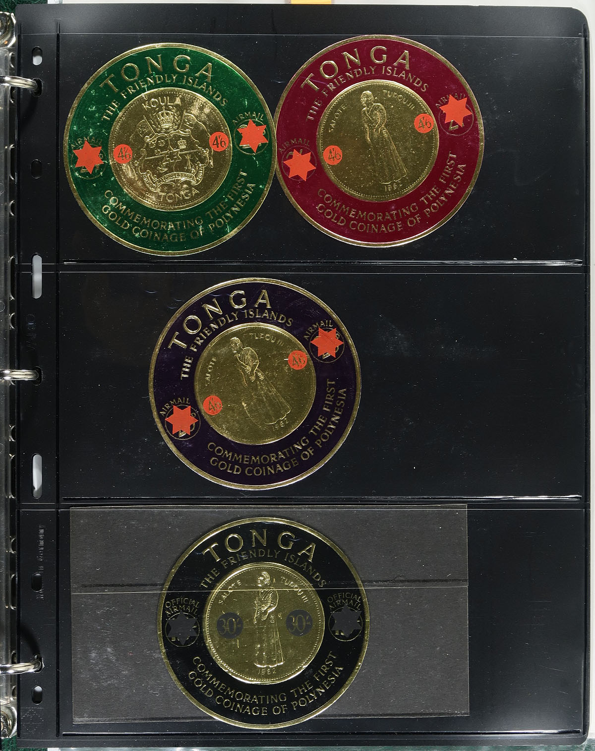 "Coins on Stamps" PART L. Lovely comprehensive topical collection containing countries from S (Spain) to T (Tonga), containing a few hundred items with representation from 8 issuing countries or states. The collection contains mint or used singles, sets, souvenir sheets, first day covers, sheetlets and more, along with well researched text detailing the relationship between philately and numismatics, with each philatelic item well identified by Scott number along with additional printing information. A spot check indicated items cataloguing $10 to $20 and up (much strength in Tonga sets), with the owner's older Scott catalogue value for the binder totals US$1,102.00. An exhibit worthy collection and very fine. Estimate =