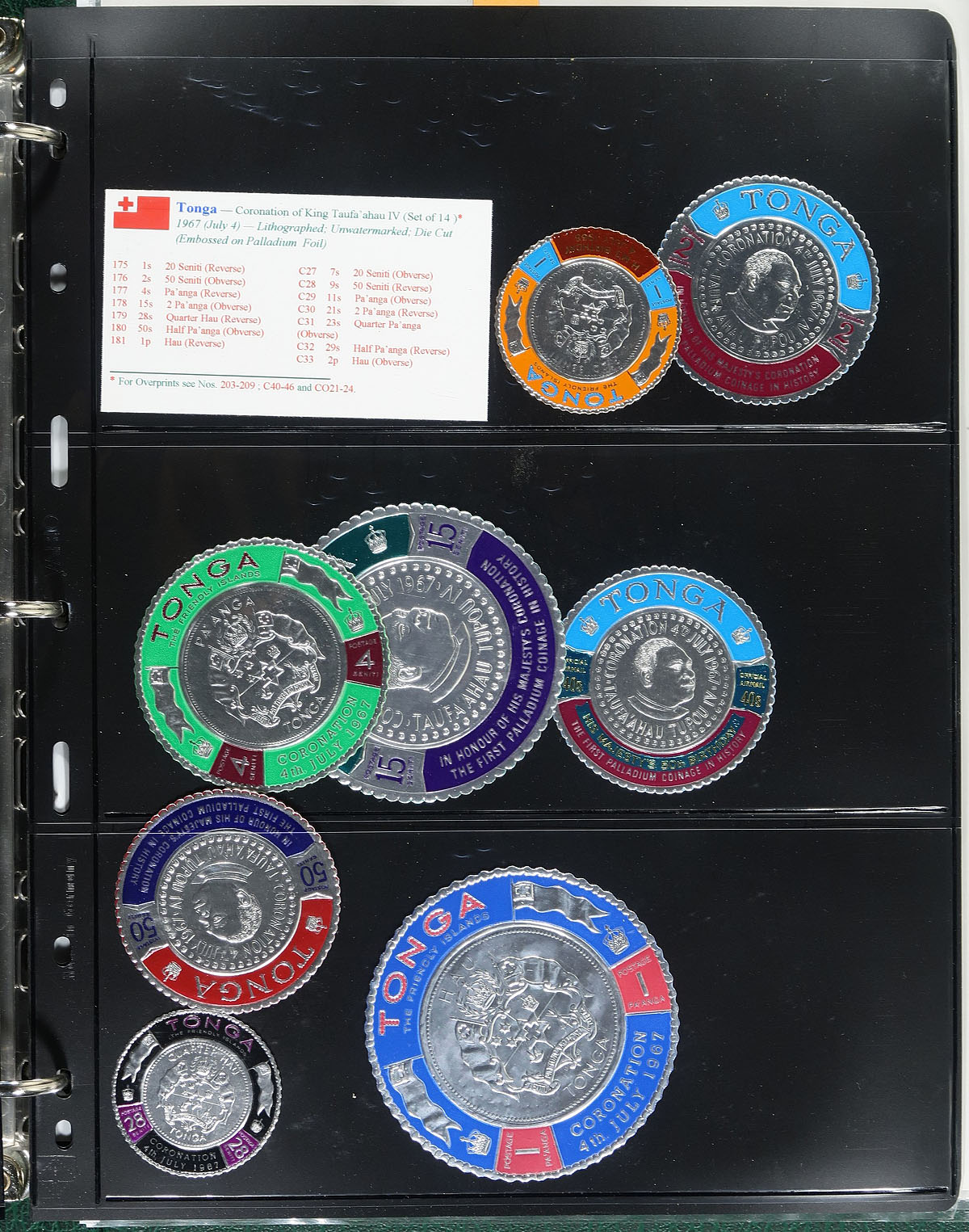 "Coins on Stamps" PART L. Lovely comprehensive topical collection containing countries from S (Spain) to T (Tonga), containing a few hundred items with representation from 8 issuing countries or states. The collection contains mint or used singles, sets, souvenir sheets, first day covers, sheetlets and more, along with well researched text detailing the relationship between philately and numismatics, with each philatelic item well identified by Scott number along with additional printing information. A spot check indicated items cataloguing $10 to $20 and up (much strength in Tonga sets), with the owner's older Scott catalogue value for the binder totals US$1,102.00. An exhibit worthy collection and very fine. Estimate =