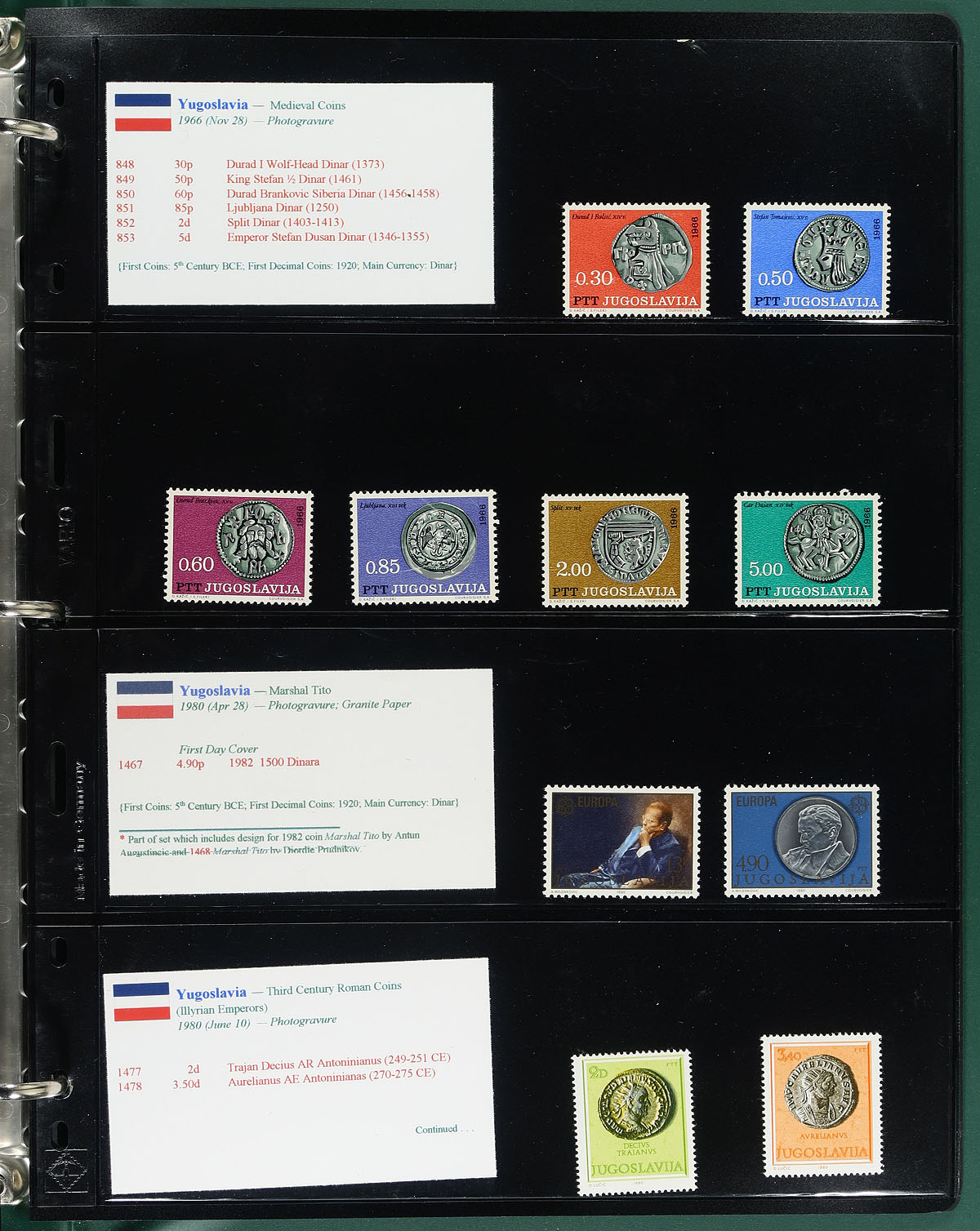 "Coins on Stamps" PART N. Lovely comprehensive topical collection containing countries from U (United States) to Y (Yugoslavia), containing a few hundred items with representation from 9 issuing countries or states. The collection contains mint or used singles, sets, souvenir sheets, first day covers, sheetlets and more, along with well researched text detailing the relationship between philately and numismatics, with each philatelic item well identified by Scott number along with additional printing information. A spot check indicated a few items cataloguing $10 to $20 and up, with the owner's older Scott catalogue value for the binder totals US$353.00. An exhibit worthy collection and very fine. Estimate =