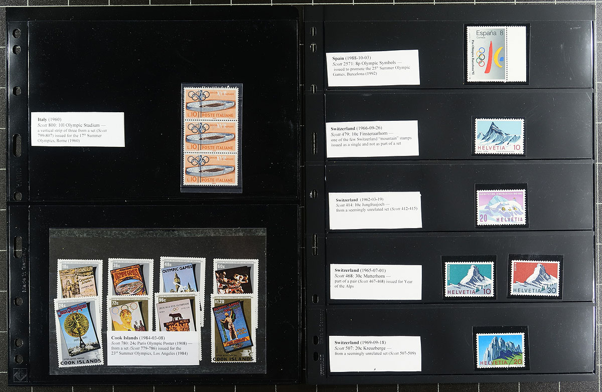 "Stamps on Coins". The companion collection to the "Coins on Stamps", containing about 100 different mint and or used stamps and a few covers, housed in a binder. The collection begins with several pages explaining the relationship between each philatelic item in the collection and minted coins, showing images of coins, related stamps, and more. A spot check indicated a few items cataloguing from $10 to $15 each, with the owner's older catalogue value for the collection totaling US$380.00. A nice collection that would take much time to duplicate. Estimate =