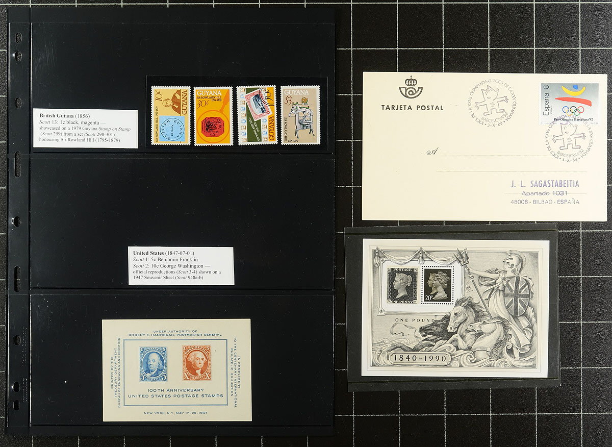 "Stamps on Coins". The companion collection to the "Coins on Stamps", containing about 100 different mint and or used stamps and a few covers, housed in a binder. The collection begins with several pages explaining the relationship between each philatelic item in the collection and minted coins, showing images of coins, related stamps, and more. A spot check indicated a few items cataloguing from $10 to $15 each, with the owner's older catalogue value for the collection totaling US$380.00. A nice collection that would take much time to duplicate. Estimate =