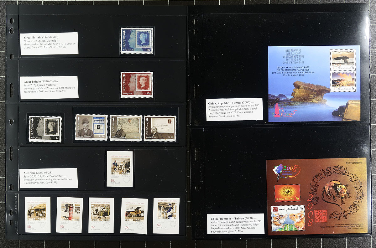 "Stamps on Coins". The companion collection to the "Coins on Stamps", containing about 100 different mint and or used stamps and a few covers, housed in a binder. The collection begins with several pages explaining the relationship between each philatelic item in the collection and minted coins, showing images of coins, related stamps, and more. A spot check indicated a few items cataloguing from $10 to $15 each, with the owner's older catalogue value for the collection totaling US$380.00. A nice collection that would take much time to duplicate. Estimate =
