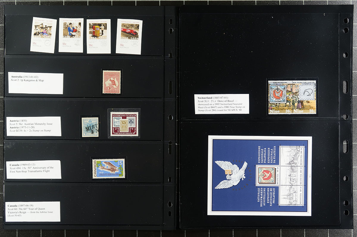 "Stamps on Coins". The companion collection to the "Coins on Stamps", containing about 100 different mint and or used stamps and a few covers, housed in a binder. The collection begins with several pages explaining the relationship between each philatelic item in the collection and minted coins, showing images of coins, related stamps, and more. A spot check indicated a few items cataloguing from $10 to $15 each, with the owner's older catalogue value for the collection totaling US$380.00. A nice collection that would take much time to duplicate. Estimate =