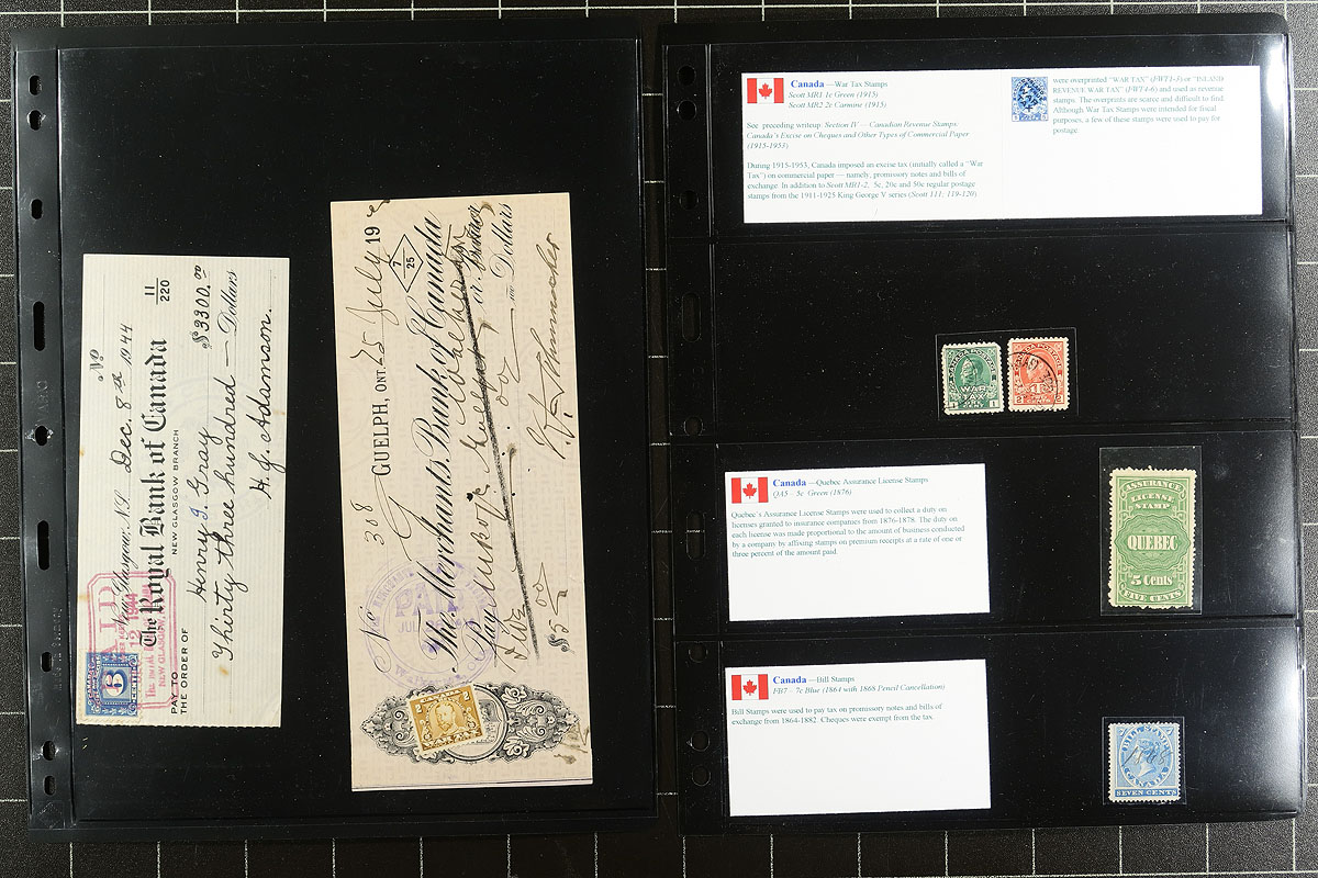 Collection of Federal and Provincial revenues, containing roughly 65 items, noting a few cheques and a document, neatly organized in several stock pages. The collection begins with roughly 10 double sided well researched pages for every item found in the collection, including notes on rates, van Dam catalogue numbers, background, design, and more, with the collection of material afterwards, noting a variety of Federal revenue stamps, and representation from most Provinces. Just a few of the better items include with van Dam #s FSC5 (used, $85), FWM2 (used, $60), NFW1 (mint, $50), along with a few items cataloguing $10 and up. Owner's older van Dam catalogue value for the collection totals $706.00. A nice, well researched collection, that should be continued. Estimate =
