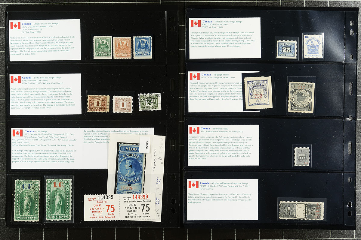 Collection of Federal and Provincial revenues, containing roughly 65 items, noting a few cheques and a document, neatly organized in several stock pages. The collection begins with roughly 10 double sided well researched pages for every item found in the collection, including notes on rates, van Dam catalogue numbers, background, design, and more, with the collection of material afterwards, noting a variety of Federal revenue stamps, and representation from most Provinces. Just a few of the better items include with van Dam #s FSC5 (used, $85), FWM2 (used, $60), NFW1 (mint, $50), along with a few items cataloguing $10 and up. Owner's older van Dam catalogue value for the collection totals $706.00. A nice, well researched collection, that should be continued. Estimate =