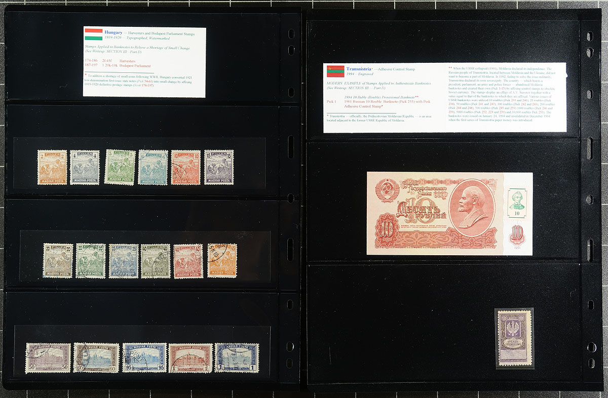 "Stamps and Currency", companion collections to the "Coins on Stamps", containing three separate collections in a binder including "Encased Postage Stamps as Emergency Money"; "Postage Stamp Money"; and "Stamps on Banknotes". The collection includes detailed information on all the material within including background information, printings, designs, catalogue information where found, and more, followed by the collection, roughly 225 items in total, noting mint and used single stamps, sets, banknotes, and more. Just a few of the better items includes 1862 United States P99 (Scott #67) mint fractional currency (owner paid $78), Russia AR15-25 (missing AR23), along with items cataloguing $10 to $20 and up. Owner's catalogue value for the lot totals US$1,080.00. A very interesting collection that should be continued, overall fine to very fine. Estimate =