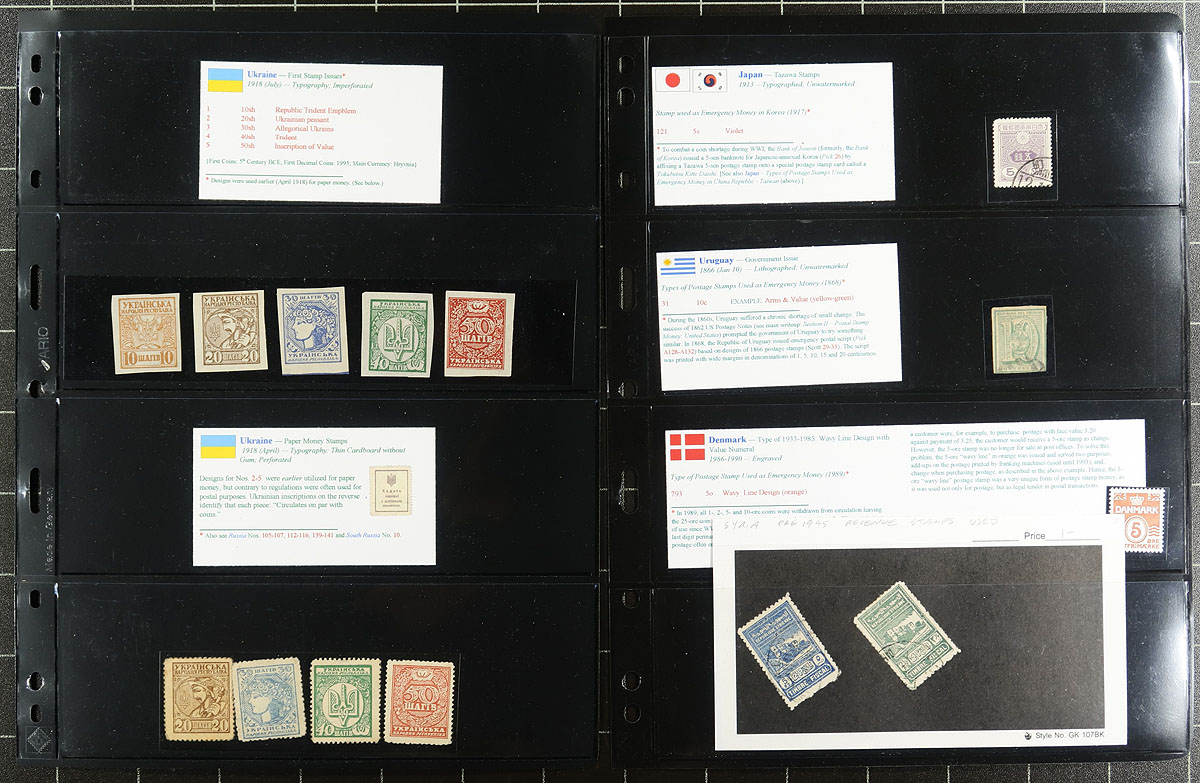 "Stamps and Currency", companion collections to the "Coins on Stamps", containing three separate collections in a binder including "Encased Postage Stamps as Emergency Money"; "Postage Stamp Money"; and "Stamps on Banknotes". The collection includes detailed information on all the material within including background information, printings, designs, catalogue information where found, and more, followed by the collection, roughly 225 items in total, noting mint and used single stamps, sets, banknotes, and more. Just a few of the better items includes 1862 United States P99 (Scott #67) mint fractional currency (owner paid $78), Russia AR15-25 (missing AR23), along with items cataloguing $10 to $20 and up. Owner's catalogue value for the lot totals US$1,080.00. A very interesting collection that should be continued, overall fine to very fine. Estimate =