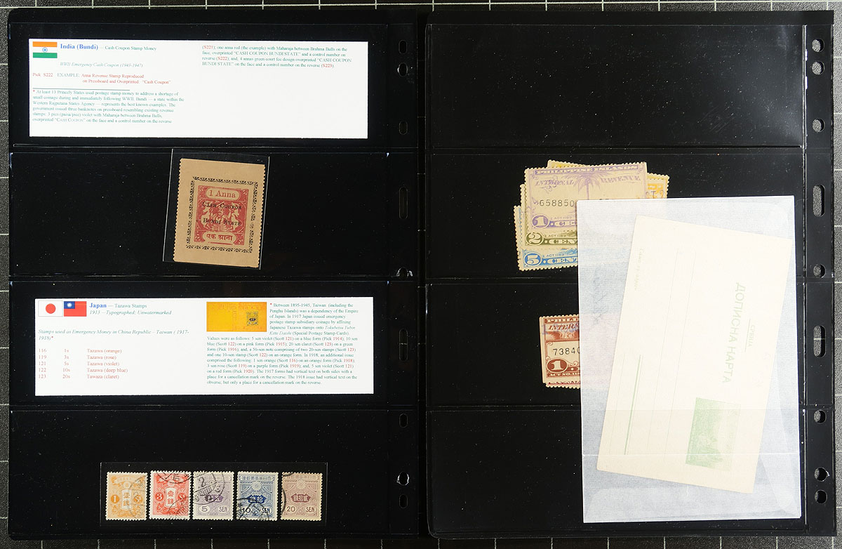 "Stamps and Currency", companion collections to the "Coins on Stamps", containing three separate collections in a binder including "Encased Postage Stamps as Emergency Money"; "Postage Stamp Money"; and "Stamps on Banknotes". The collection includes detailed information on all the material within including background information, printings, designs, catalogue information where found, and more, followed by the collection, roughly 225 items in total, noting mint and used single stamps, sets, banknotes, and more. Just a few of the better items includes 1862 United States P99 (Scott #67) mint fractional currency (owner paid $78), Russia AR15-25 (missing AR23), along with items cataloguing $10 to $20 and up. Owner's catalogue value for the lot totals US$1,080.00. A very interesting collection that should be continued, overall fine to very fine. Estimate =