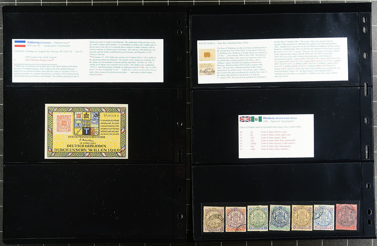 "Stamps and Currency", companion collections to the "Coins on Stamps", containing three separate collections in a binder including "Encased Postage Stamps as Emergency Money"; "Postage Stamp Money"; and "Stamps on Banknotes". The collection includes detailed information on all the material within including background information, printings, designs, catalogue information where found, and more, followed by the collection, roughly 225 items in total, noting mint and used single stamps, sets, banknotes, and more. Just a few of the better items includes 1862 United States P99 (Scott #67) mint fractional currency (owner paid $78), Russia AR15-25 (missing AR23), along with items cataloguing $10 to $20 and up. Owner's catalogue value for the lot totals US$1,080.00. A very interesting collection that should be continued, overall fine to very fine. Estimate =