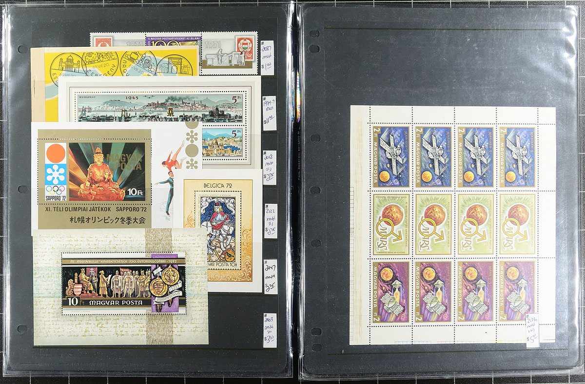 Nice group of primarily never hinged Hungary souvenir sheets, 1930's-1980's, containing roughly 135 sheets in over 30 stock pages. We note the majority of sheets have been identified and priced using Scott numbers and older catalogue values, with a spot check indicating a few sheets cataloguing $15 and up, including Scott #486 (x2, mh, $125 total). Owner's older Scott catalogue value for the lot totals US$890.00. A nice lot for collectors and dealers alike. Estimate =