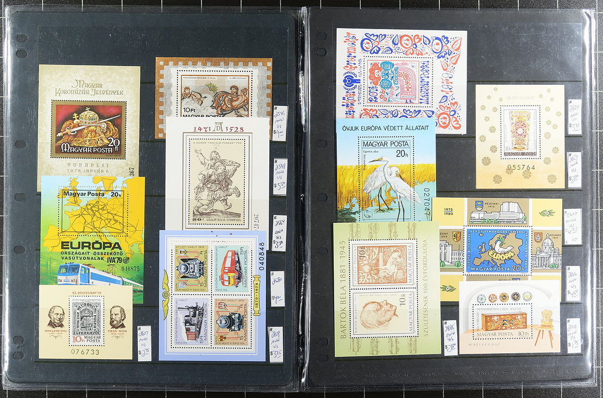 Nice group of primarily never hinged Hungary souvenir sheets, 1930's-1980's, containing roughly 135 sheets in over 30 stock pages. We note the majority of sheets have been identified and priced using Scott numbers and older catalogue values, with a spot check indicating a few sheets cataloguing $15 and up, including Scott #486 (x2, mh, $125 total). Owner's older Scott catalogue value for the lot totals US$890.00. A nice lot for collectors and dealers alike. Estimate =