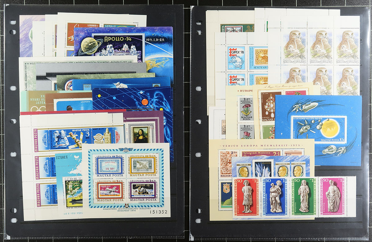 Nice group of primarily never hinged Hungary souvenir sheets, 1930's-1980's, containing roughly 135 sheets in over 30 stock pages. We note the majority of sheets have been identified and priced using Scott numbers and older catalogue values, with a spot check indicating a few sheets cataloguing $15 and up, including Scott #486 (x2, mh, $125 total). Owner's older Scott catalogue value for the lot totals US$890.00. A nice lot for collectors and dealers alike. Estimate =