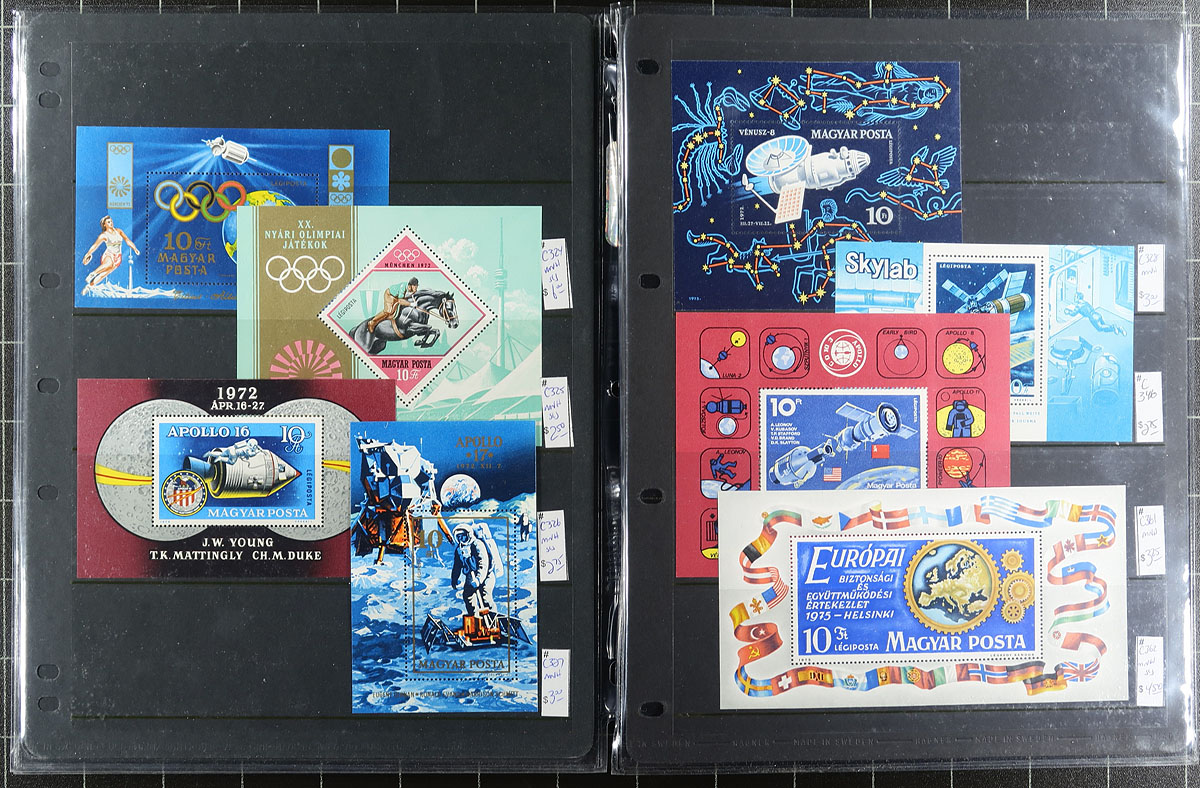 Nice group of primarily never hinged Hungary souvenir sheets, 1930's-1980's, containing roughly 135 sheets in over 30 stock pages. We note the majority of sheets have been identified and priced using Scott numbers and older catalogue values, with a spot check indicating a few sheets cataloguing $15 and up, including Scott #486 (x2, mh, $125 total). Owner's older Scott catalogue value for the lot totals US$890.00. A nice lot for collectors and dealers alike. Estimate =