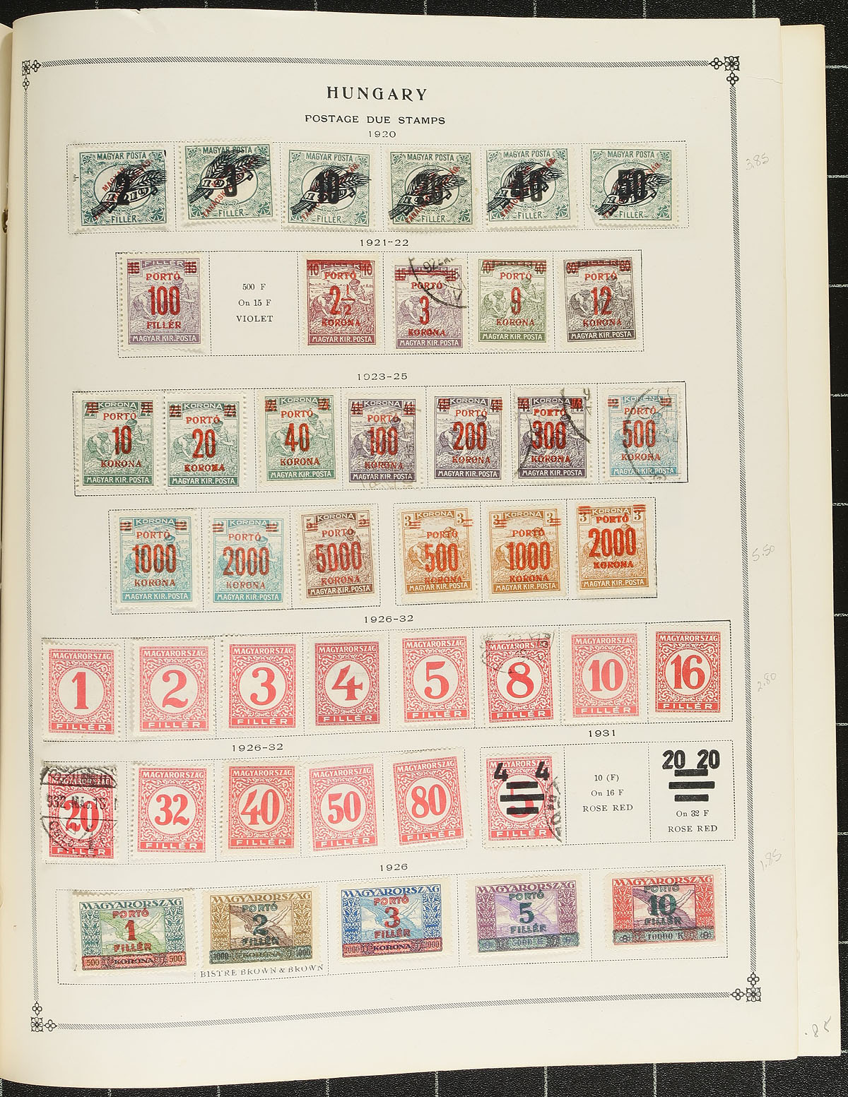 Collections / accumulation of used Hungary, 1871-1977, containing roughly 1,500 stamps in over 100 album or stock pages. The lot generally ranges from Scott #1/2499, and includes a decent selection of early used include Scott #s 1, 3 (x3), 4 (x2), 5, and continues with sets, partial sets, and back of the book material noting newspaper stamps, postage dues and more. A spot check indicated a few stamps, sets, and partial sets, cataloguing $15 and up, with the owner's older catalogue value for the lot totaling US$1,030.00. Postmark interest includes cds types, with several "socked on the nose" town postmarks. A nice lot for the Hungary or worldwide used collector. Estimate =