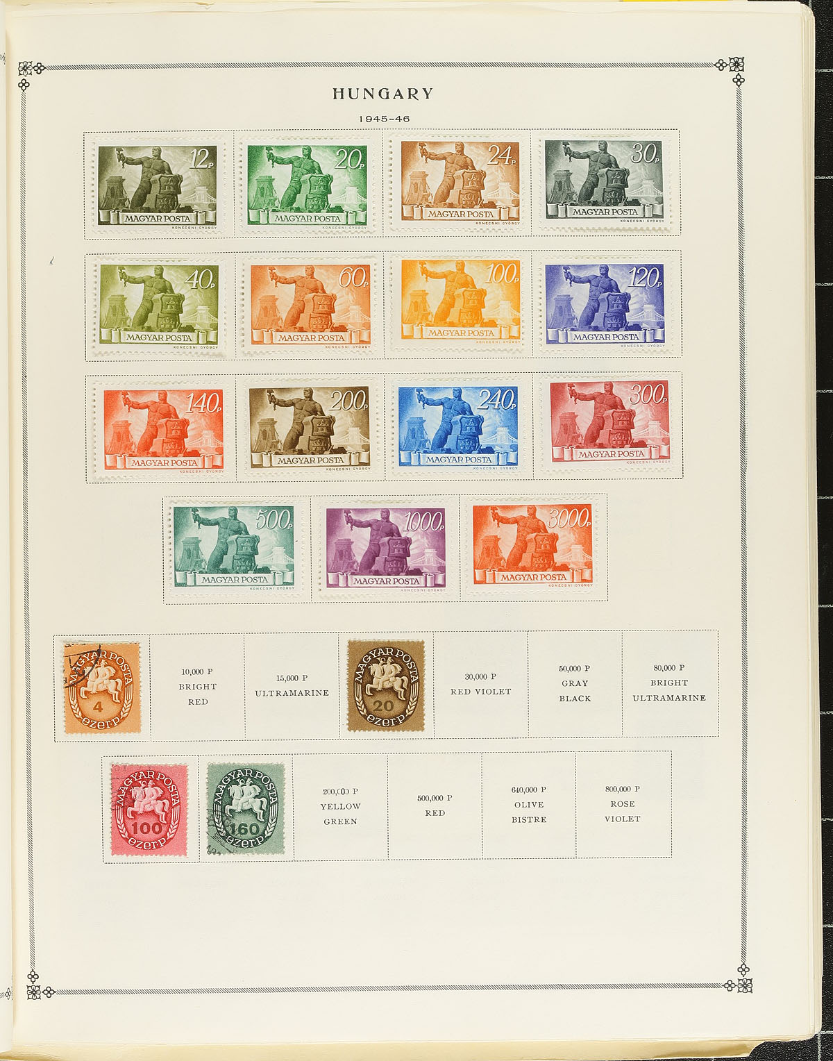 Collections / accumulation of used Hungary, 1871-1977, containing roughly 1,500 stamps in over 100 album or stock pages. The lot generally ranges from Scott #1/2499, and includes a decent selection of early used include Scott #s 1, 3 (x3), 4 (x2), 5, and continues with sets, partial sets, and back of the book material noting newspaper stamps, postage dues and more. A spot check indicated a few stamps, sets, and partial sets, cataloguing $15 and up, with the owner's older catalogue value for the lot totaling US$1,030.00. Postmark interest includes cds types, with several "socked on the nose" town postmarks. A nice lot for the Hungary or worldwide used collector. Estimate =