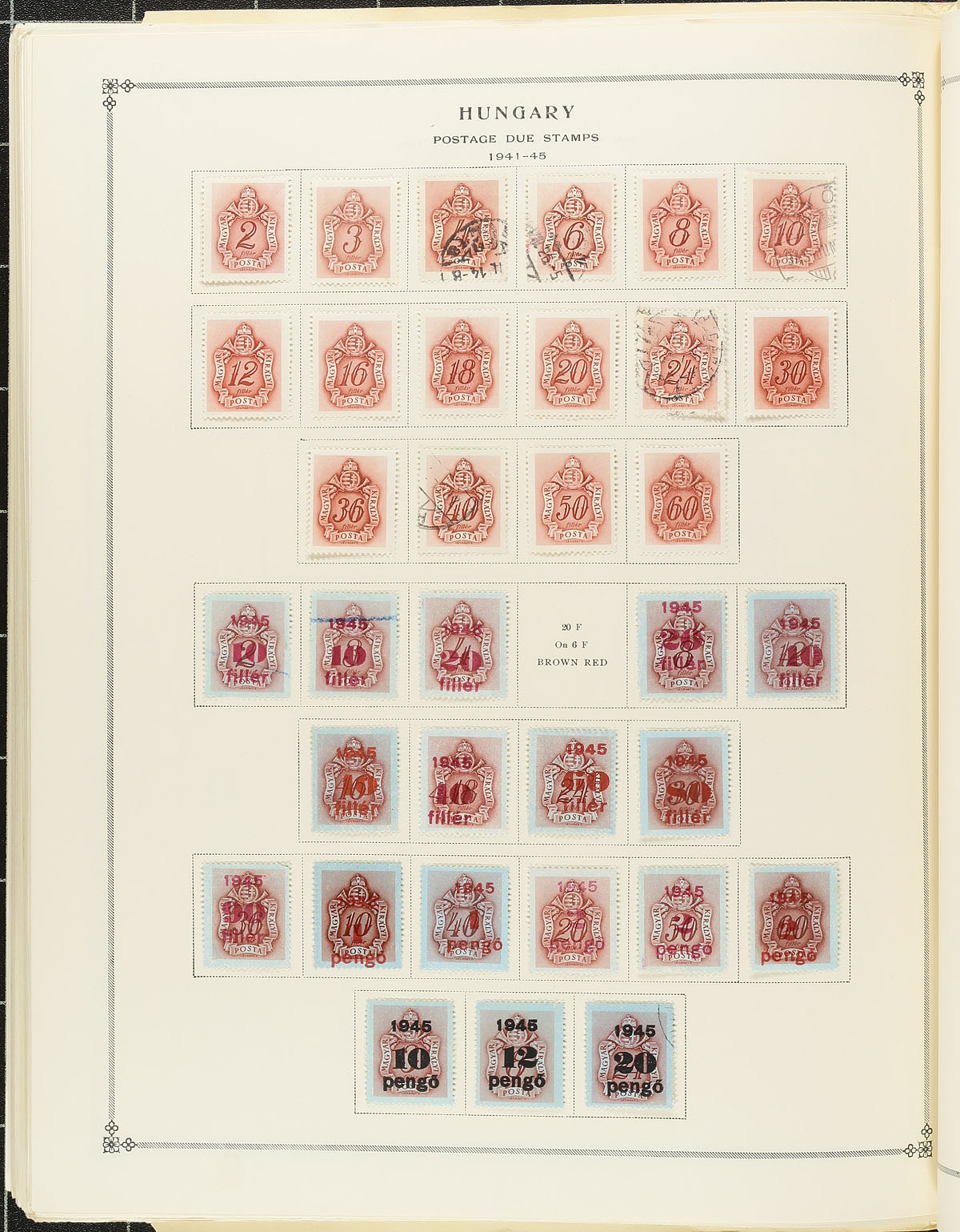 Collections / accumulation of used Hungary, 1871-1977, containing roughly 1,500 stamps in over 100 album or stock pages. The lot generally ranges from Scott #1/2499, and includes a decent selection of early used include Scott #s 1, 3 (x3), 4 (x2), 5, and continues with sets, partial sets, and back of the book material noting newspaper stamps, postage dues and more. A spot check indicated a few stamps, sets, and partial sets, cataloguing $15 and up, with the owner's older catalogue value for the lot totaling US$1,030.00. Postmark interest includes cds types, with several "socked on the nose" town postmarks. A nice lot for the Hungary or worldwide used collector. Estimate =