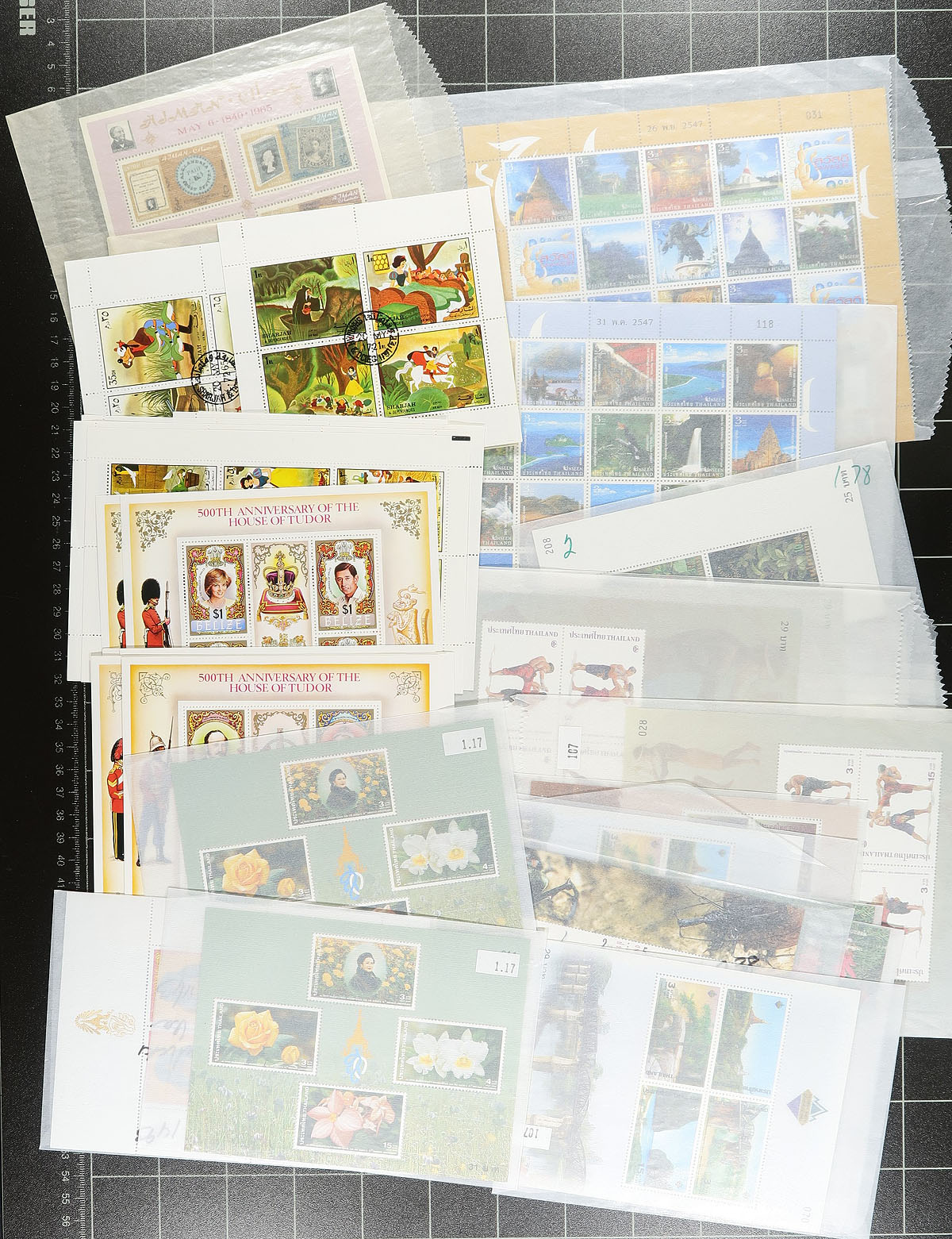 Lovely group of primarily never hinged worldwide souvenir sheets, generally ranging from the 1960's to the 1990's, containing roughly 350 with most in individual glassines, noting better representation from British Commonwealth, Middle East, Asia (Thailand in particular) and a few other countries. The lot also includes 35 dealer stock cards containing primarily imperforate pair sets from St. Vincent (all identified by catalogue number). The strength of the lot is the many topical and thematic subjects found within including Disney, Elvis, transportation (including space), nature, famous people, sports, Olympics, and more. A nice clean lot with a variety of uses for collectors and dealers alike. Estimate =