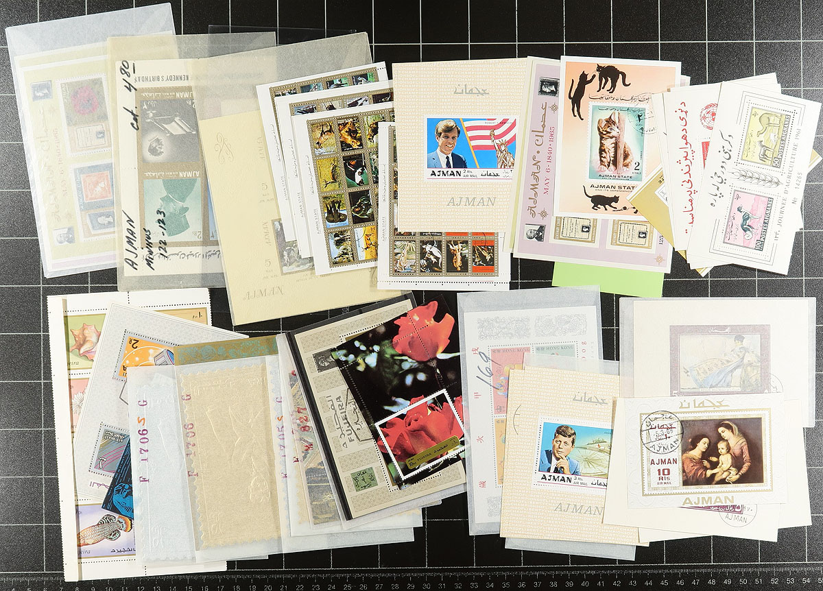 Lovely group of primarily never hinged worldwide souvenir sheets, generally ranging from the 1960's to the 1990's, containing roughly 350 with most in individual glassines, noting better representation from British Commonwealth, Middle East, Asia (Thailand in particular) and a few other countries. The lot also includes 35 dealer stock cards containing primarily imperforate pair sets from St. Vincent (all identified by catalogue number). The strength of the lot is the many topical and thematic subjects found within including Disney, Elvis, transportation (including space), nature, famous people, sports, Olympics, and more. A nice clean lot with a variety of uses for collectors and dealers alike. Estimate =