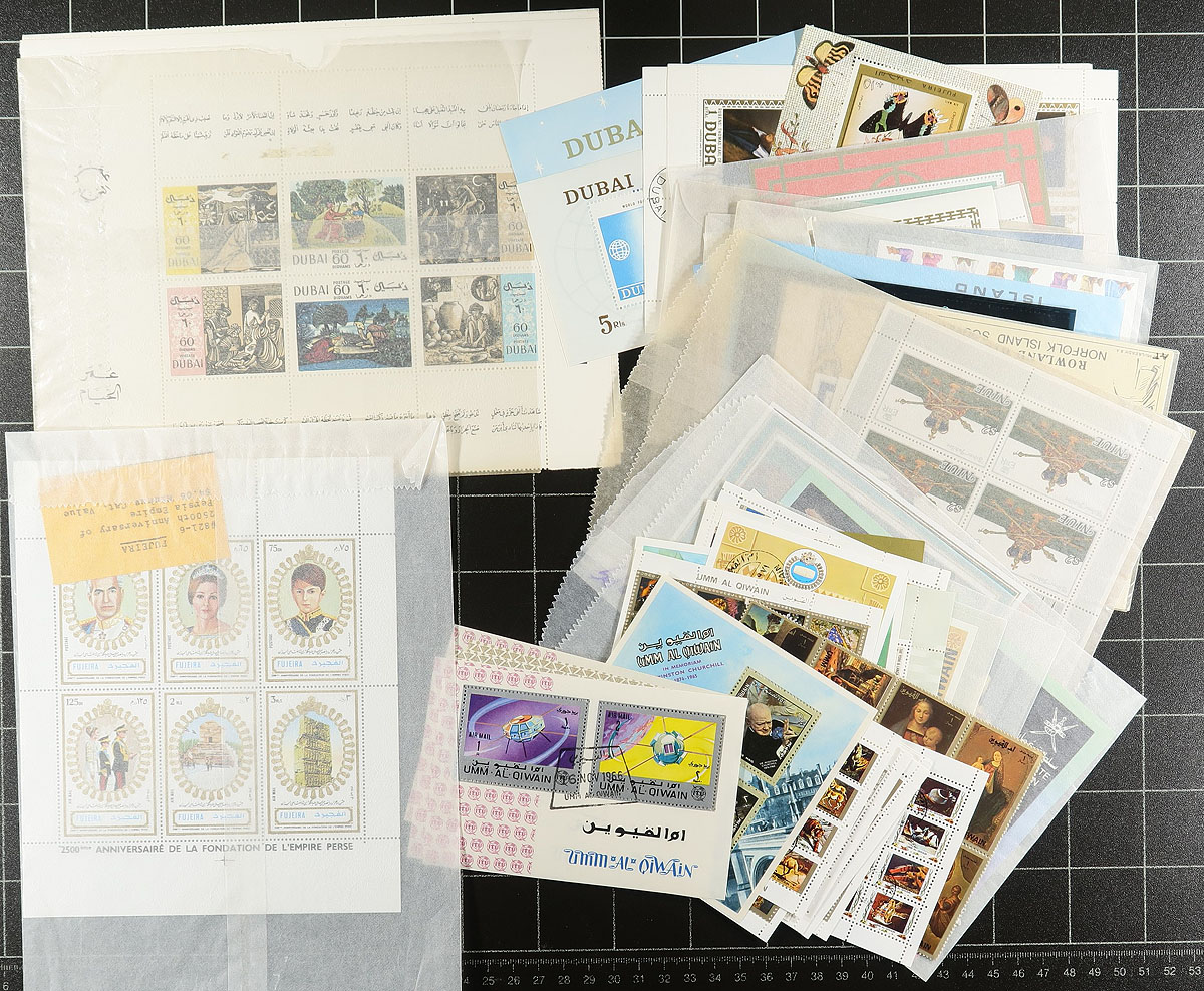 Lovely group of primarily never hinged worldwide souvenir sheets, generally ranging from the 1960's to the 1990's, containing roughly 350 with most in individual glassines, noting better representation from British Commonwealth, Middle East, Asia (Thailand in particular) and a few other countries. The lot also includes 35 dealer stock cards containing primarily imperforate pair sets from St. Vincent (all identified by catalogue number). The strength of the lot is the many topical and thematic subjects found within including Disney, Elvis, transportation (including space), nature, famous people, sports, Olympics, and more. A nice clean lot with a variety of uses for collectors and dealers alike. Estimate =