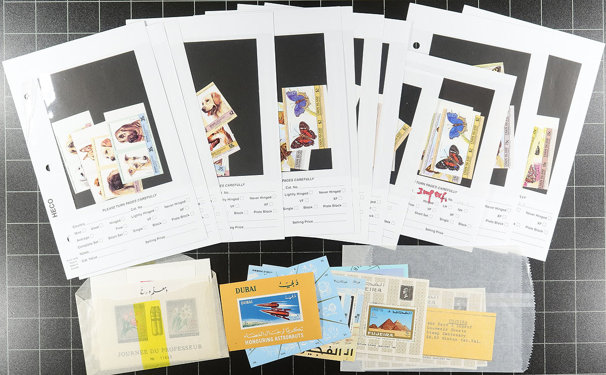 Lovely group of primarily never hinged worldwide souvenir sheets, generally ranging from the 1960's to the 1990's, containing roughly 350 with most in individual glassines, noting better representation from British Commonwealth, Middle East, Asia (Thailand in particular) and a few other countries. The lot also includes 35 dealer stock cards containing primarily imperforate pair sets from St. Vincent (all identified by catalogue number). The strength of the lot is the many topical and thematic subjects found within including Disney, Elvis, transportation (including space), nature, famous people, sports, Olympics, and more. A nice clean lot with a variety of uses for collectors and dealers alike. Estimate =