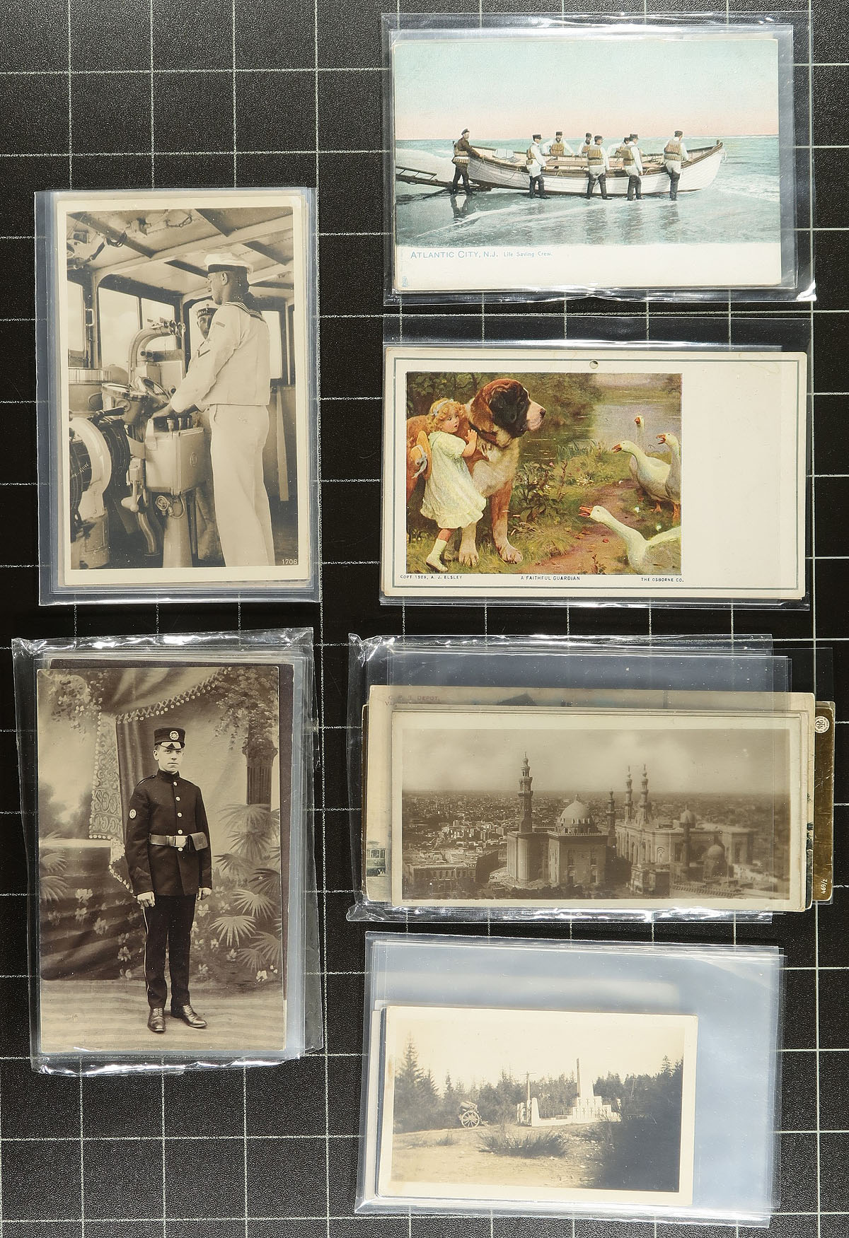 A diverse selection of several different topics of postcards, while not enough of any one topic for a single lot, together the make for an excellent postcard selection (we offered a similar lot structure last month, of different topics). Included, in no particular order. 1) Topical Collection of "Lifesavers" with 5 postcards from Eastern USA featuring Ocean Lifeguards / Live Saving crews. 2) Eary USA "Osborne Co" sample cards, featuring Children / Dogs x4. 3) Germany WWII and earlier U-Boat postcards x5 including RPPC (real photo postcars). 4) Salvation Army Topical Collection of 13 postcards, many real photo postcards. 5) "Bookmark" sized postcards x6, with views of Art Deco Ladies, Vancouver and Egypt. 6) A dozen "miniature" postcards (worldwide). 7) Young Women "Romance" postcards x59 (the largest group), all looking to primarily WWI era. A total of 104 postcards, perfect for the collector or dealer. Estimate =