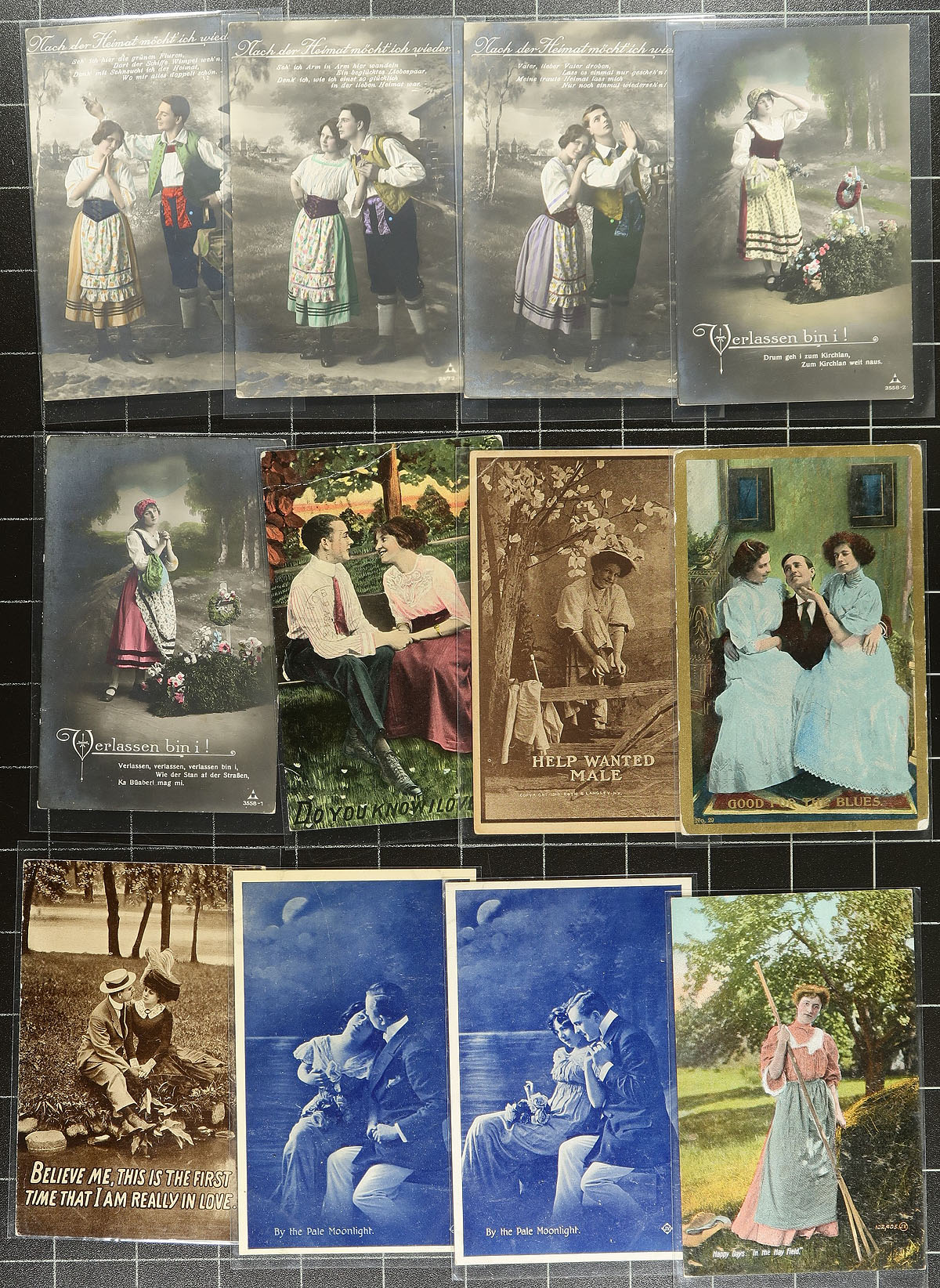 A diverse selection of several different topics of postcards, while not enough of any one topic for a single lot, together the make for an excellent postcard selection (we offered a similar lot structure last month, of different topics). Included, in no particular order. 1) Topical Collection of "Lifesavers" with 5 postcards from Eastern USA featuring Ocean Lifeguards / Live Saving crews. 2) Eary USA "Osborne Co" sample cards, featuring Children / Dogs x4. 3) Germany WWII and earlier U-Boat postcards x5 including RPPC (real photo postcars). 4) Salvation Army Topical Collection of 13 postcards, many real photo postcards. 5) "Bookmark" sized postcards x6, with views of Art Deco Ladies, Vancouver and Egypt. 6) A dozen "miniature" postcards (worldwide). 7) Young Women "Romance" postcards x59 (the largest group), all looking to primarily WWI era. A total of 104 postcards, perfect for the collector or dealer. Estimate =