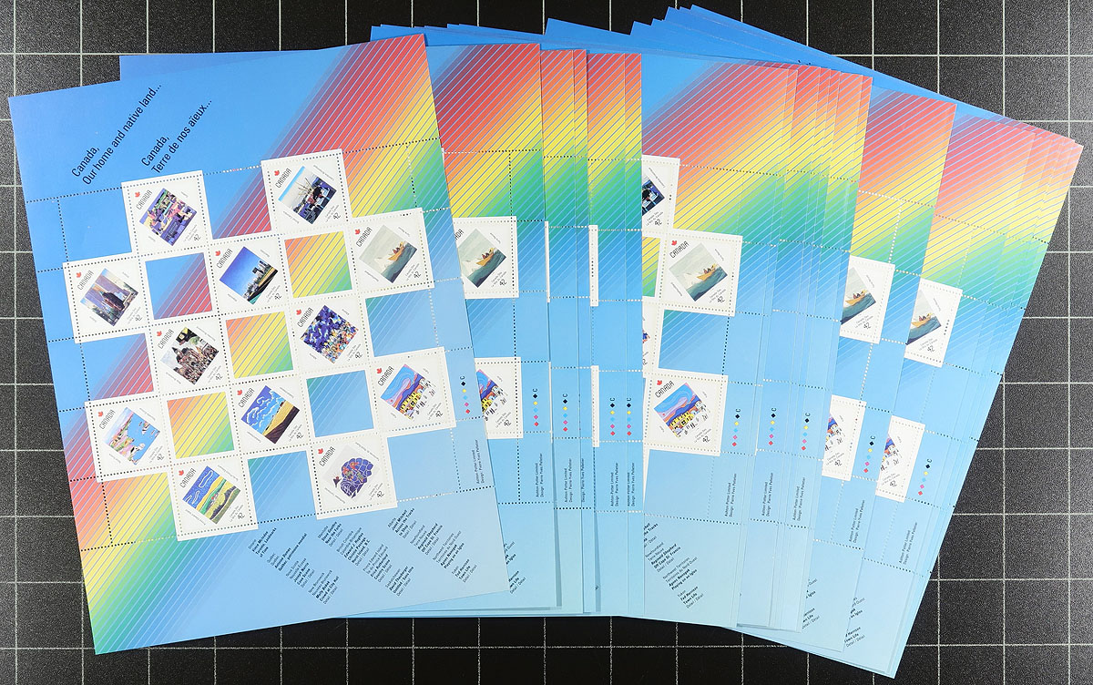 Substantial investment/dealer lot of 20 x VF mint NH 1992 issue Canada Day se-tenant panes of 12 x 42c stamps (plus 13 labels). The total face value of the sheets is $100.80 but these usually wholesale for considerably higher than face value. A couple of the usual handing bends as often seen with these large format sheets, but overall a very clean lot. 2025/2026 Unitrade =