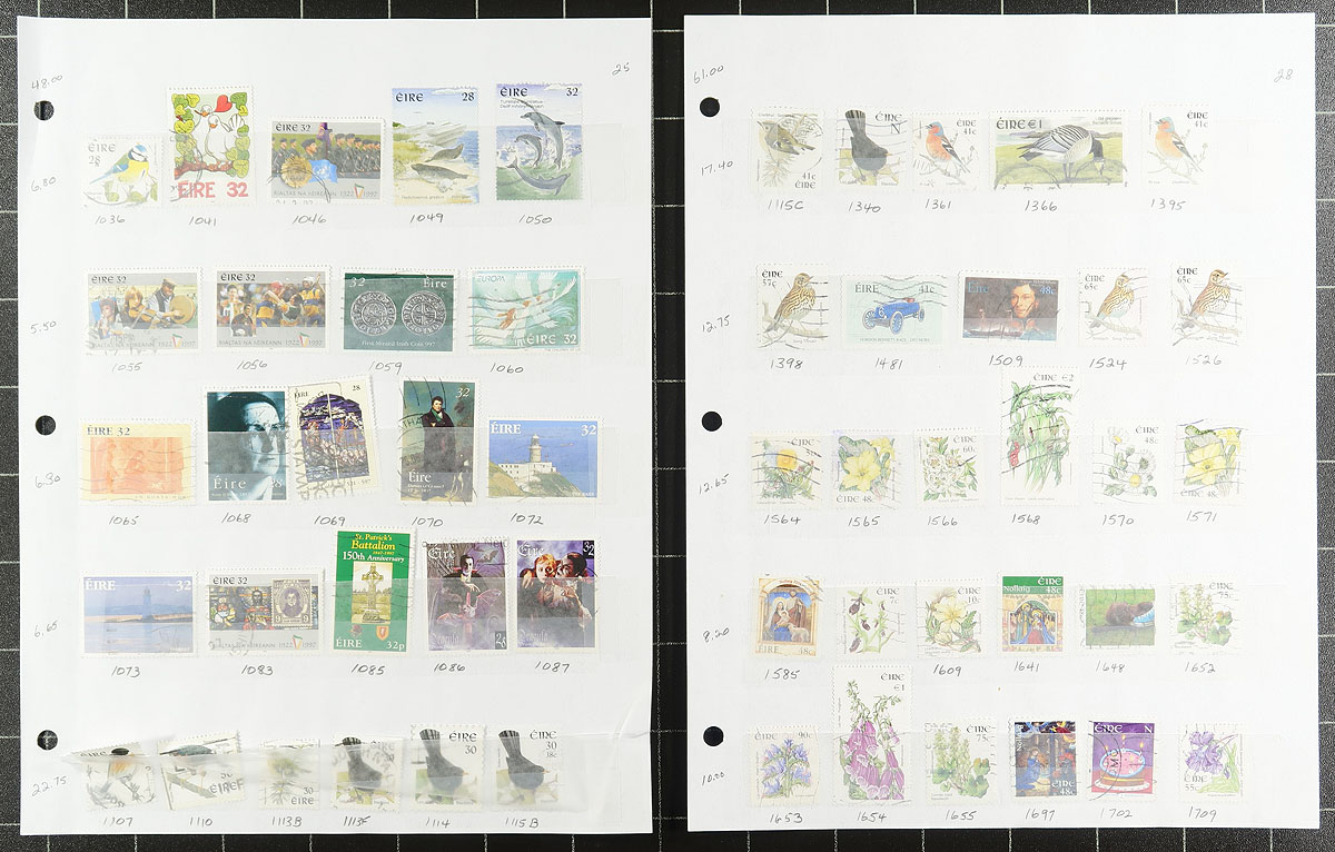 Large collection / accumulation of used Ireland, 1922-2014, containing over 2,000 stamps in roughly 25 stock or album pages. The lot generally ranges from Scott #1/2043, including a selection of self adhesives and back of the book issues. A spot check indicated a few singles and partial sets cataloguing $10 and up, with owner's 2018 Scott catalogue value for the lot totals US$1,428.00, leaving better finds to the dedicated collector. Some duplication encountered for a few issues, overall fine to very fine. Estimate =
