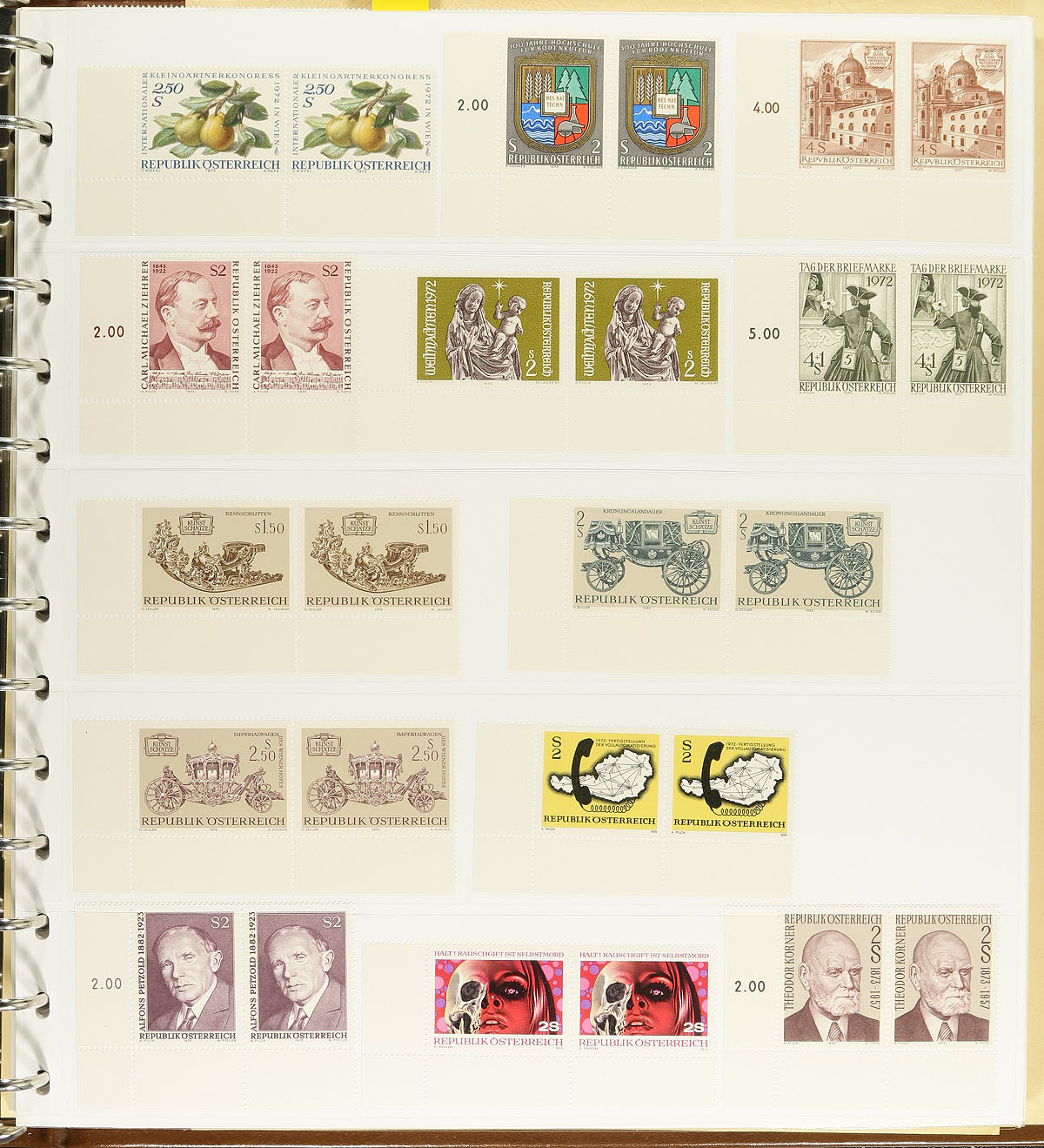 Nice collection of mint Austria, 1958-1983, containing roughly 1,400 stamps in a hingeless SAFE album with a slipcase. The lot generally ranges from Scott #620/1263, mostly collected in pairs with many have sheet values in the selvedge, along with a few pre-1950's issues. A spot check indicated a mix of hinged and never hinged material, with the majority of issues cataloguing $1 and under, still making this lot worth several hundreds of dollars. Ideal for collectors and dealers alike. Estimate =