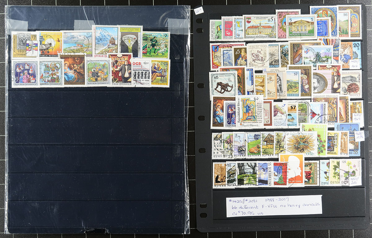 Collection of used Austria, 1858-2014, containing roughly 1,000 stamps in several stockpages. The collection generally ranges from Scott #9/2460, with the vast majority of stamps ranging from the 1950's onwards, noting singles, sets, partial sets, a few souvenir sheets and "back of the book" material. Owner's 2018 Scott catalogue value for the lot totals US$1,628.00, leaving better finds for the dedicated collector. Postmark interest includes cds types, noting a few "socked on the nose" town cancels. A good lot for the used collector, overall fine to very fine. Estimate =