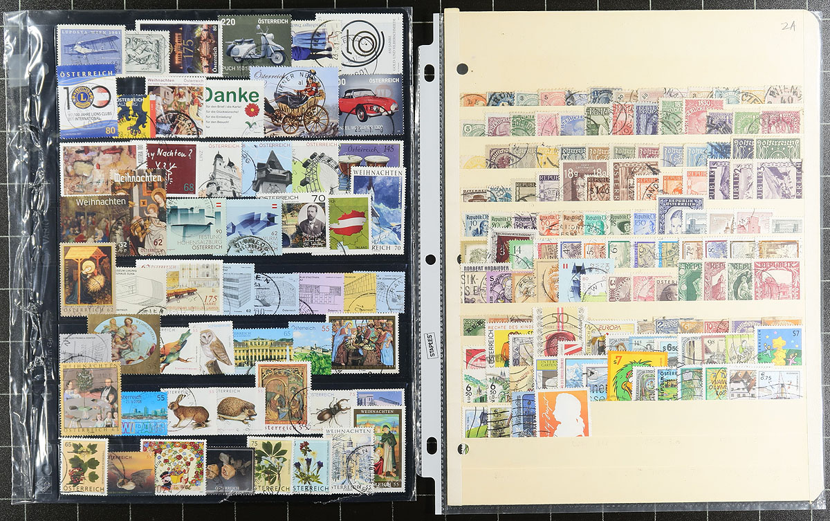 Collection of used Austria, 1858-2014, containing roughly 1,000 stamps in several stockpages. The collection generally ranges from Scott #9/2460, with the vast majority of stamps ranging from the 1950's onwards, noting singles, sets, partial sets, a few souvenir sheets and "back of the book" material. Owner's 2018 Scott catalogue value for the lot totals US$1,628.00, leaving better finds for the dedicated collector. Postmark interest includes cds types, noting a few "socked on the nose" town cancels. A good lot for the used collector, overall fine to very fine. Estimate =