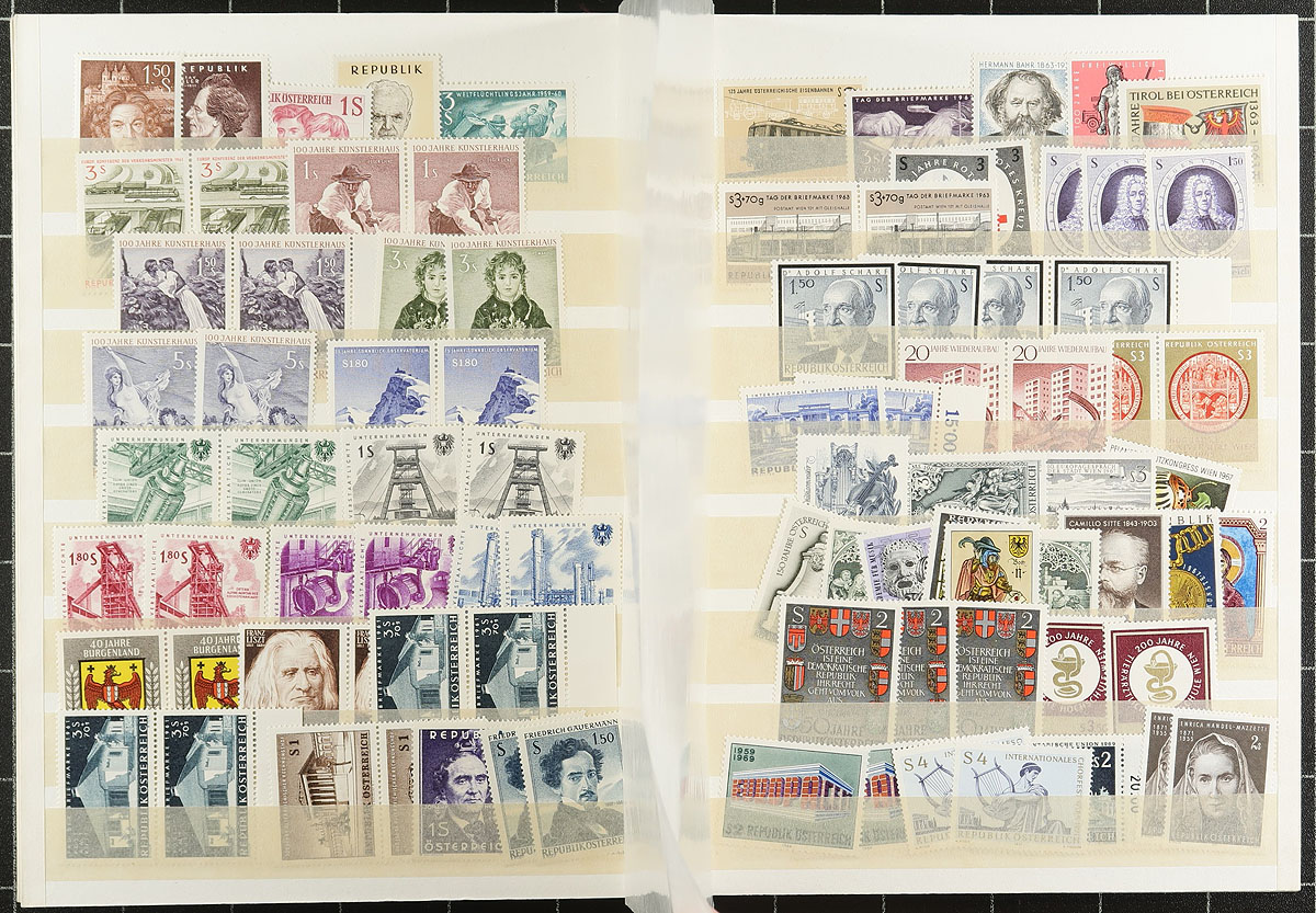 Accumulation of primarily never hinged Austria, 1900's-1990's, containing several hundreds of stamps in a variety of formats including a couple of stockbooks, album and stock pages, glassines, etc. A spot check indicated material primarily ranging from Scott #91/1608, including a few airmails, souvenir sheets, and more, with a few items cataloguing $10 and up. Owner's 2018 Scott value for the lot totals US$937.00. A nice lot for all collectors. Estimate =