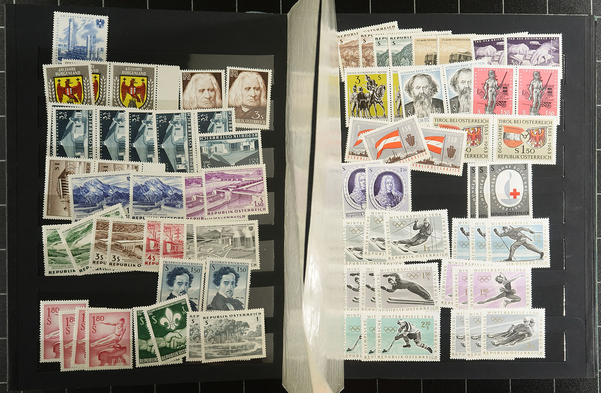 Accumulation of primarily never hinged Austria, 1900's-1990's, containing several hundreds of stamps in a variety of formats including a couple of stockbooks, album and stock pages, glassines, etc. A spot check indicated material primarily ranging from Scott #91/1608, including a few airmails, souvenir sheets, and more, with a few items cataloguing $10 and up. Owner's 2018 Scott value for the lot totals US$937.00. A nice lot for all collectors. Estimate =