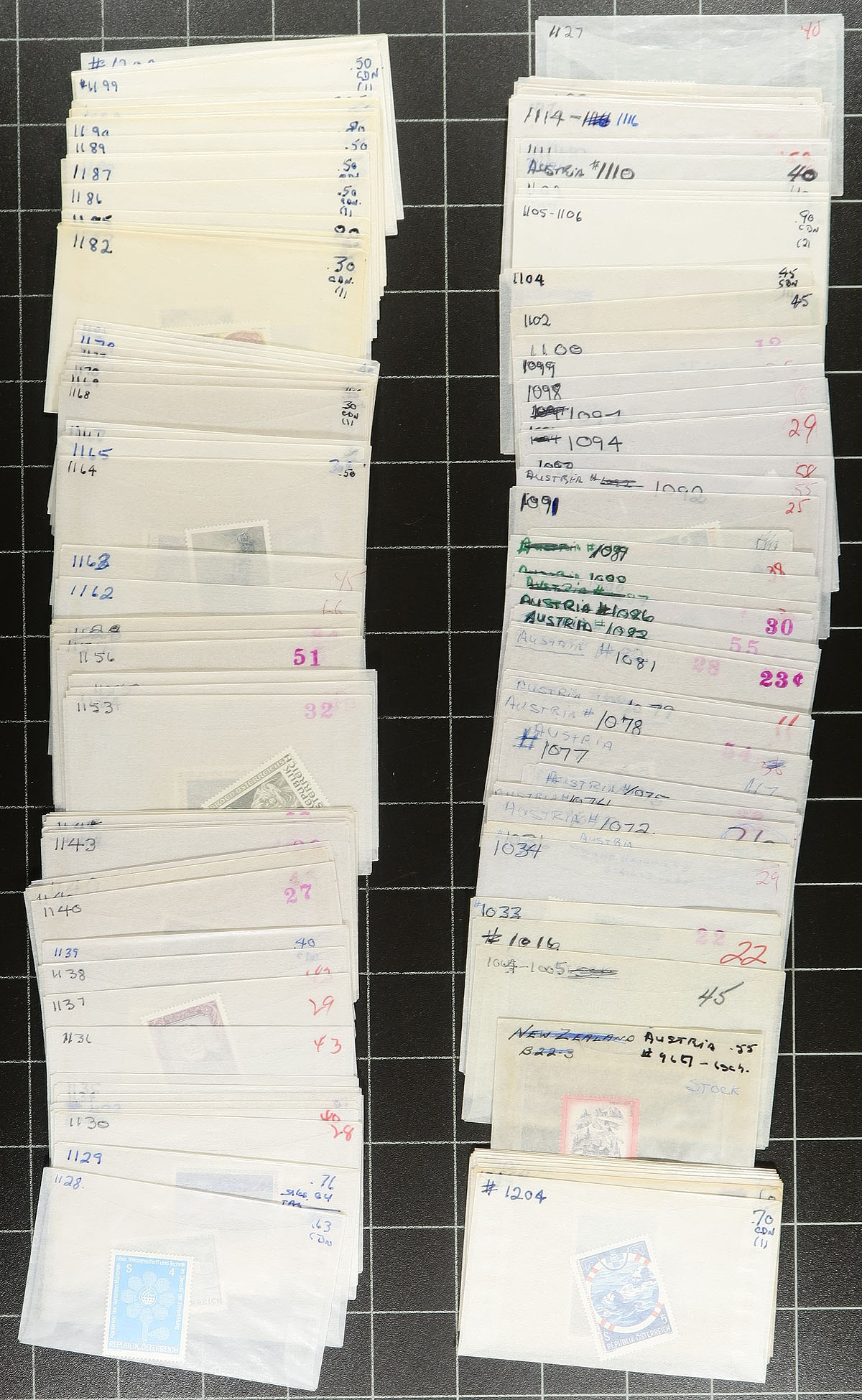Accumulation of primarily never hinged Austria, 1900's-1990's, containing several hundreds of stamps in a variety of formats including a couple of stockbooks, album and stock pages, glassines, etc. A spot check indicated material primarily ranging from Scott #91/1608, including a few airmails, souvenir sheets, and more, with a few items cataloguing $10 and up. Owner's 2018 Scott value for the lot totals US$937.00. A nice lot for all collectors. Estimate =