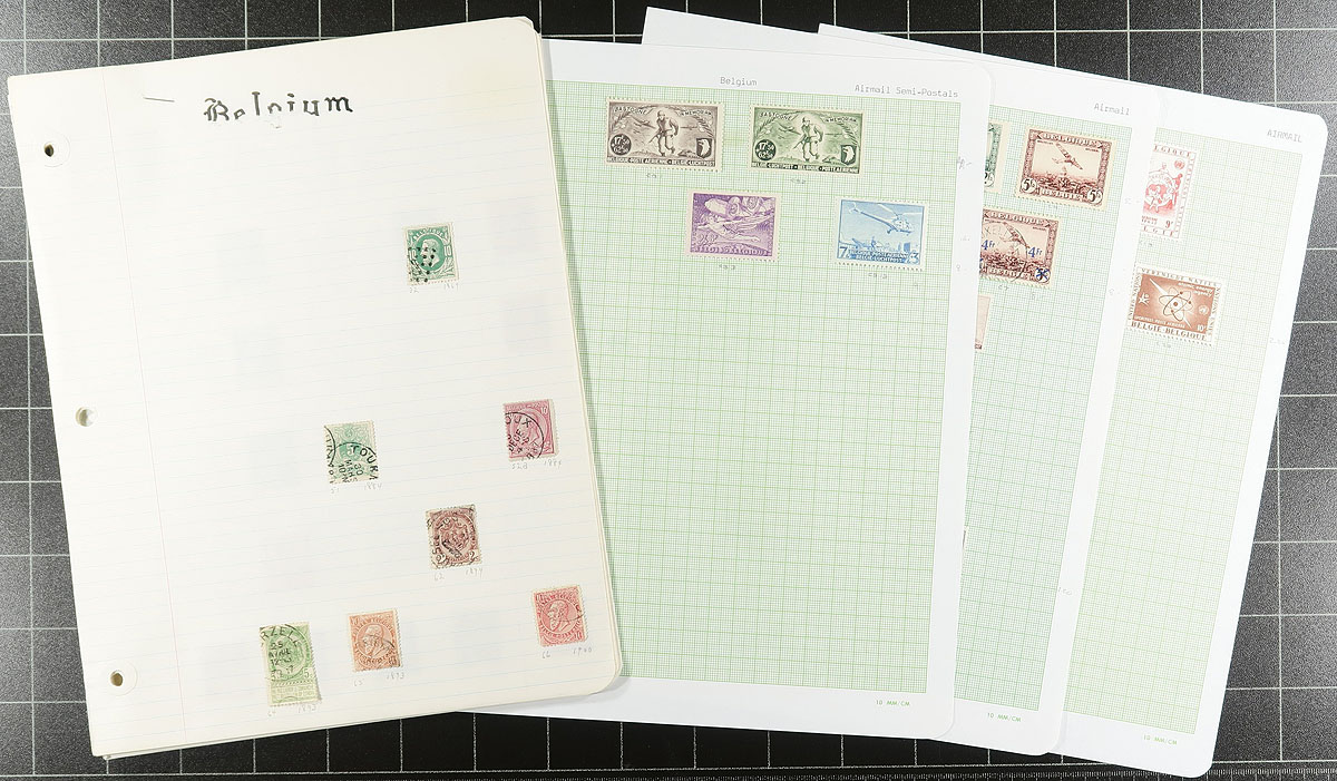 Accumulation of primarily used Belgium, 1860's-1980's, containing probably 1,000 stamps in over 20 stock or album pages. A spot check indicated a small selection of early issues, along with a selection of mint and used parcel posts and other back of the book issues, with a few singles, sets, and partial sets cataloging in the $5 to $10 range. Postmark interest includes cds, numeral, and other types including some "socked on the nose" town cancels. A nice lot with possible finds for the dedicated collector, overall fine to very fine. Estimate =