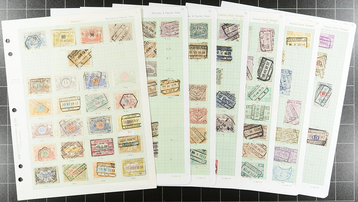 Accumulation of primarily used Belgium, 1860's-1980's, containing probably 1,000 stamps in over 20 stock or album pages. A spot check indicated a small selection of early issues, along with a selection of mint and used parcel posts and other back of the book issues, with a few singles, sets, and partial sets cataloging in the $5 to $10 range. Postmark interest includes cds, numeral, and other types including some "socked on the nose" town cancels. A nice lot with possible finds for the dedicated collector, overall fine to very fine. Estimate =