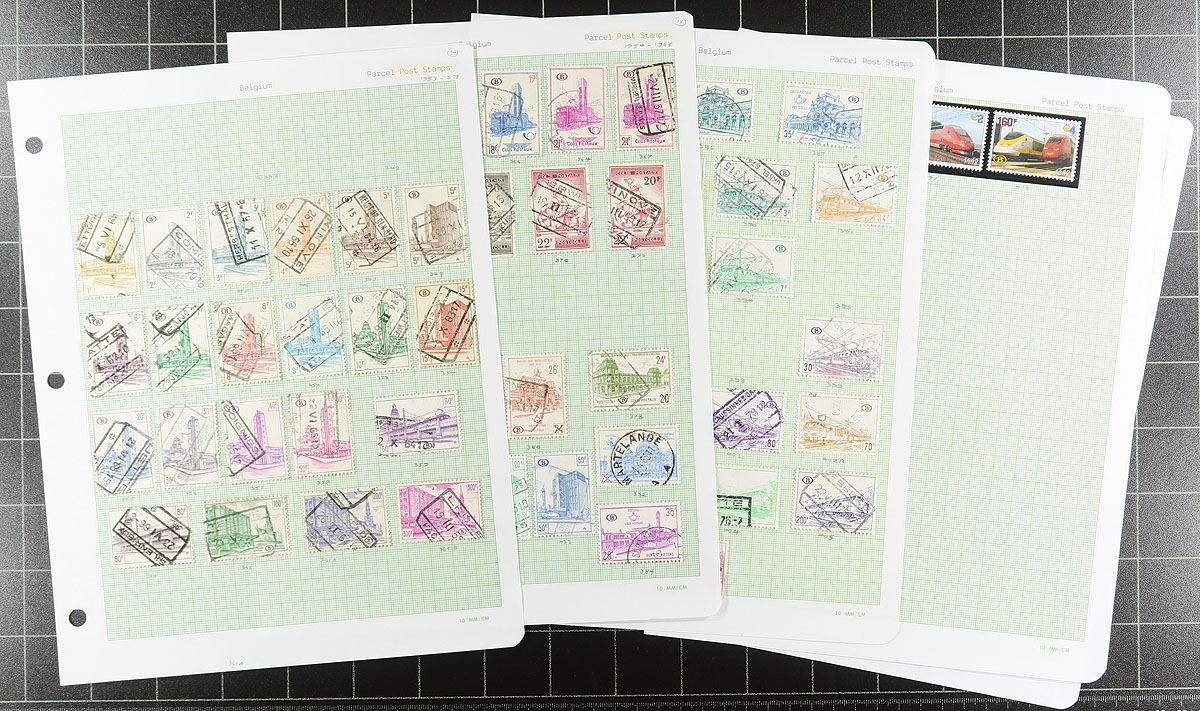 Accumulation of primarily used Belgium, 1860's-1980's, containing probably 1,000 stamps in over 20 stock or album pages. A spot check indicated a small selection of early issues, along with a selection of mint and used parcel posts and other back of the book issues, with a few singles, sets, and partial sets cataloging in the $5 to $10 range. Postmark interest includes cds, numeral, and other types including some "socked on the nose" town cancels. A nice lot with possible finds for the dedicated collector, overall fine to very fine. Estimate =