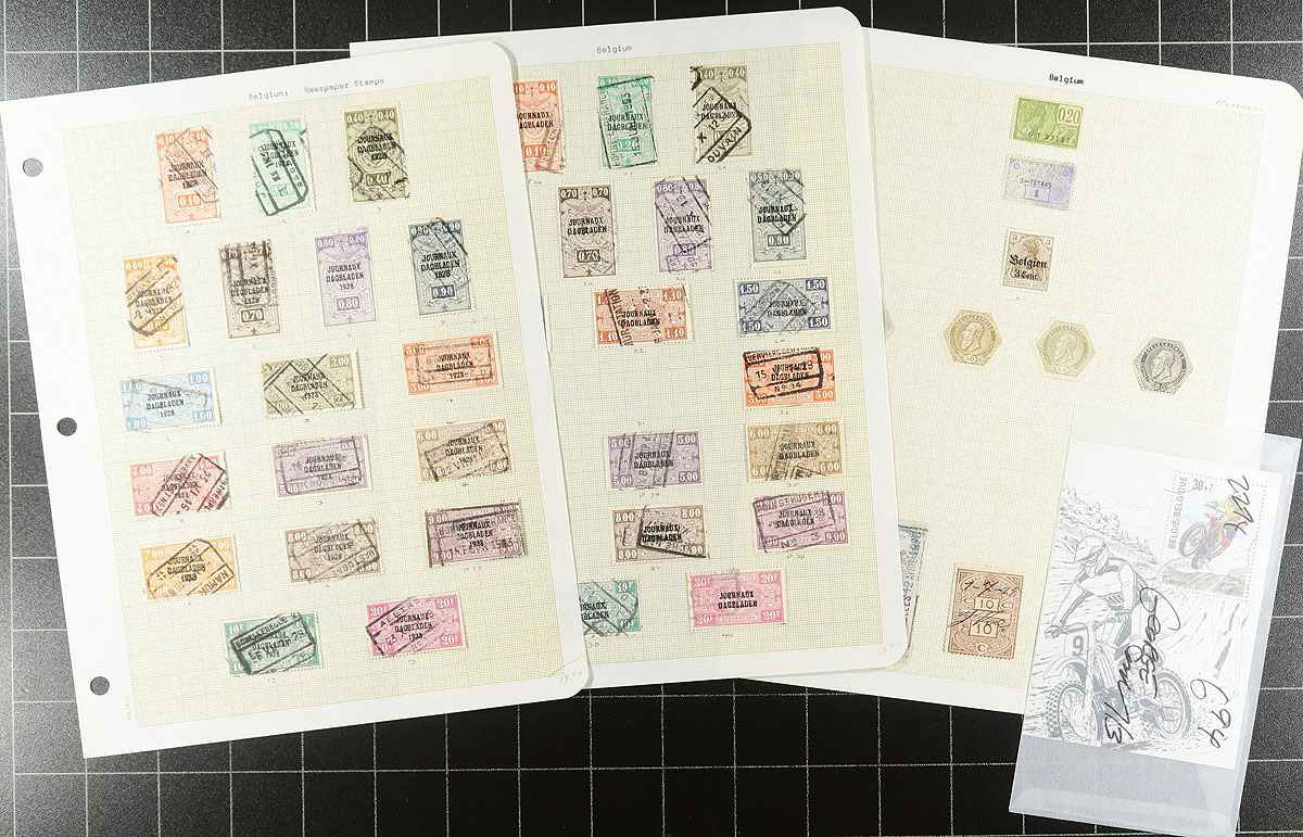 Accumulation of primarily used Belgium, 1860's-1980's, containing probably 1,000 stamps in over 20 stock or album pages. A spot check indicated a small selection of early issues, along with a selection of mint and used parcel posts and other back of the book issues, with a few singles, sets, and partial sets cataloging in the $5 to $10 range. Postmark interest includes cds, numeral, and other types including some "socked on the nose" town cancels. A nice lot with possible finds for the dedicated collector, overall fine to very fine. Estimate =