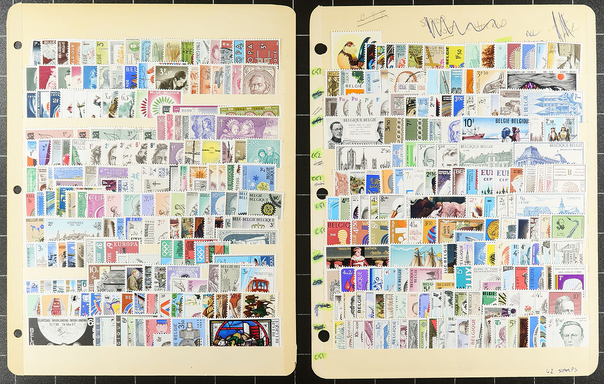 Accumulation of primarily used Belgium, 1860's-1980's, containing probably 1,000 stamps in over 20 stock or album pages. A spot check indicated a small selection of early issues, along with a selection of mint and used parcel posts and other back of the book issues, with a few singles, sets, and partial sets cataloging in the $5 to $10 range. Postmark interest includes cds, numeral, and other types including some "socked on the nose" town cancels. A nice lot with possible finds for the dedicated collector, overall fine to very fine. Estimate =