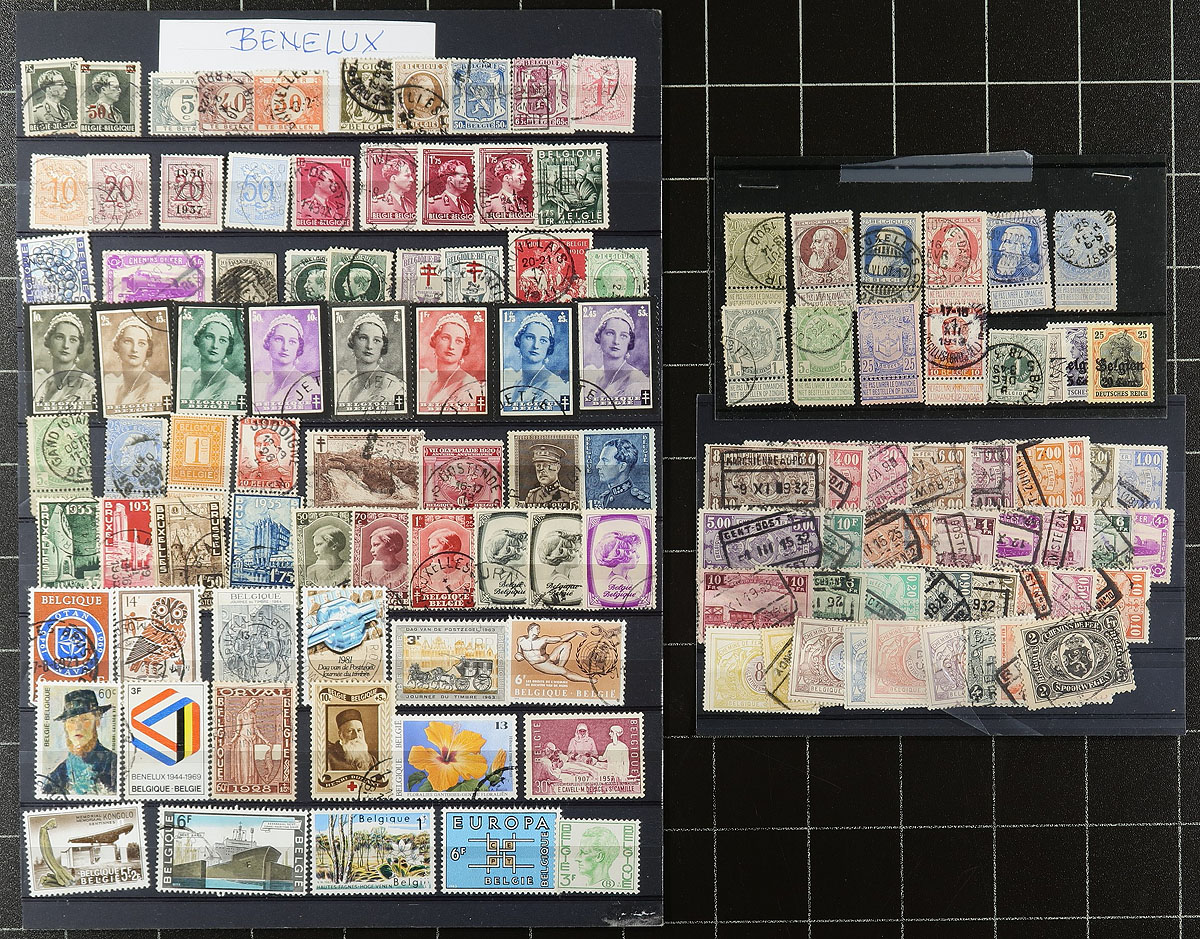 Accumulation of primarily used Belgium, 1860's-1980's, containing probably 1,000 stamps in over 20 stock or album pages. A spot check indicated a small selection of early issues, along with a selection of mint and used parcel posts and other back of the book issues, with a few singles, sets, and partial sets cataloging in the $5 to $10 range. Postmark interest includes cds, numeral, and other types including some "socked on the nose" town cancels. A nice lot with possible finds for the dedicated collector, overall fine to very fine. Estimate =
