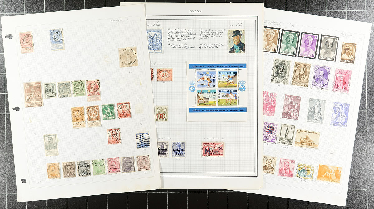 Accumulation of primarily used Belgium, 1860's-1980's, containing probably 1,000 stamps in over 20 stock or album pages. A spot check indicated a small selection of early issues, along with a selection of mint and used parcel posts and other back of the book issues, with a few singles, sets, and partial sets cataloging in the $5 to $10 range. Postmark interest includes cds, numeral, and other types including some "socked on the nose" town cancels. A nice lot with possible finds for the dedicated collector, overall fine to very fine. Estimate =
