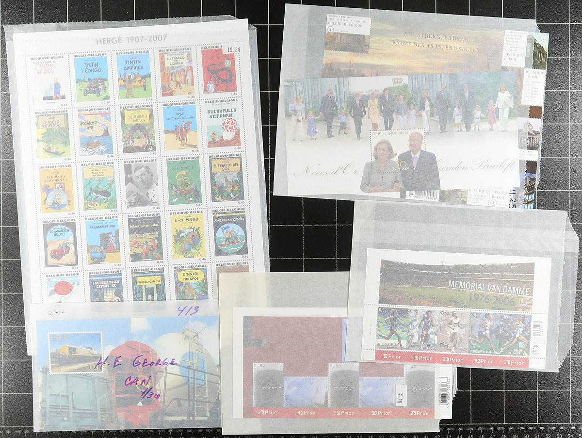 Nice group of roughly 75 never hinged Belgium souvenir sheets, generally ranging from 2005-2009, with a spot check indicating some souvenir sheets, and a few sheetlets, cataloguing $7 to $15 and up each. A nice lot for all collectors and dealers looking for clean material, as much of the material is still in original packaging from the philatelic services. Should be worth our low estimate. Estimate =