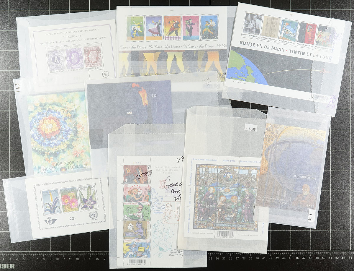 Nice group of roughly 75 never hinged Belgium souvenir sheets, generally ranging from 2005-2009, with a spot check indicating some souvenir sheets, and a few sheetlets, cataloguing $7 to $15 and up each. A nice lot for all collectors and dealers looking for clean material, as much of the material is still in original packaging from the philatelic services. Should be worth our low estimate. Estimate =